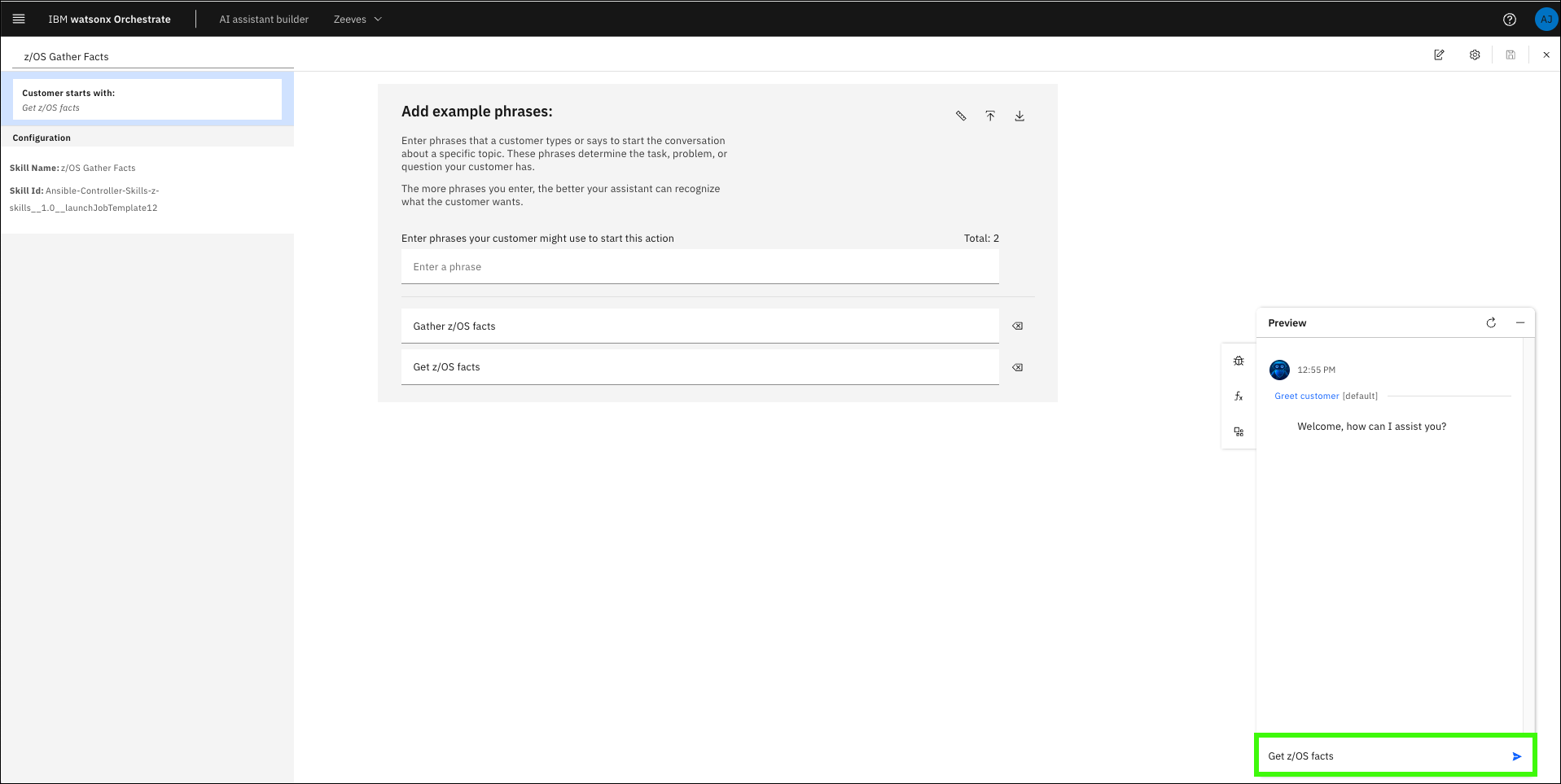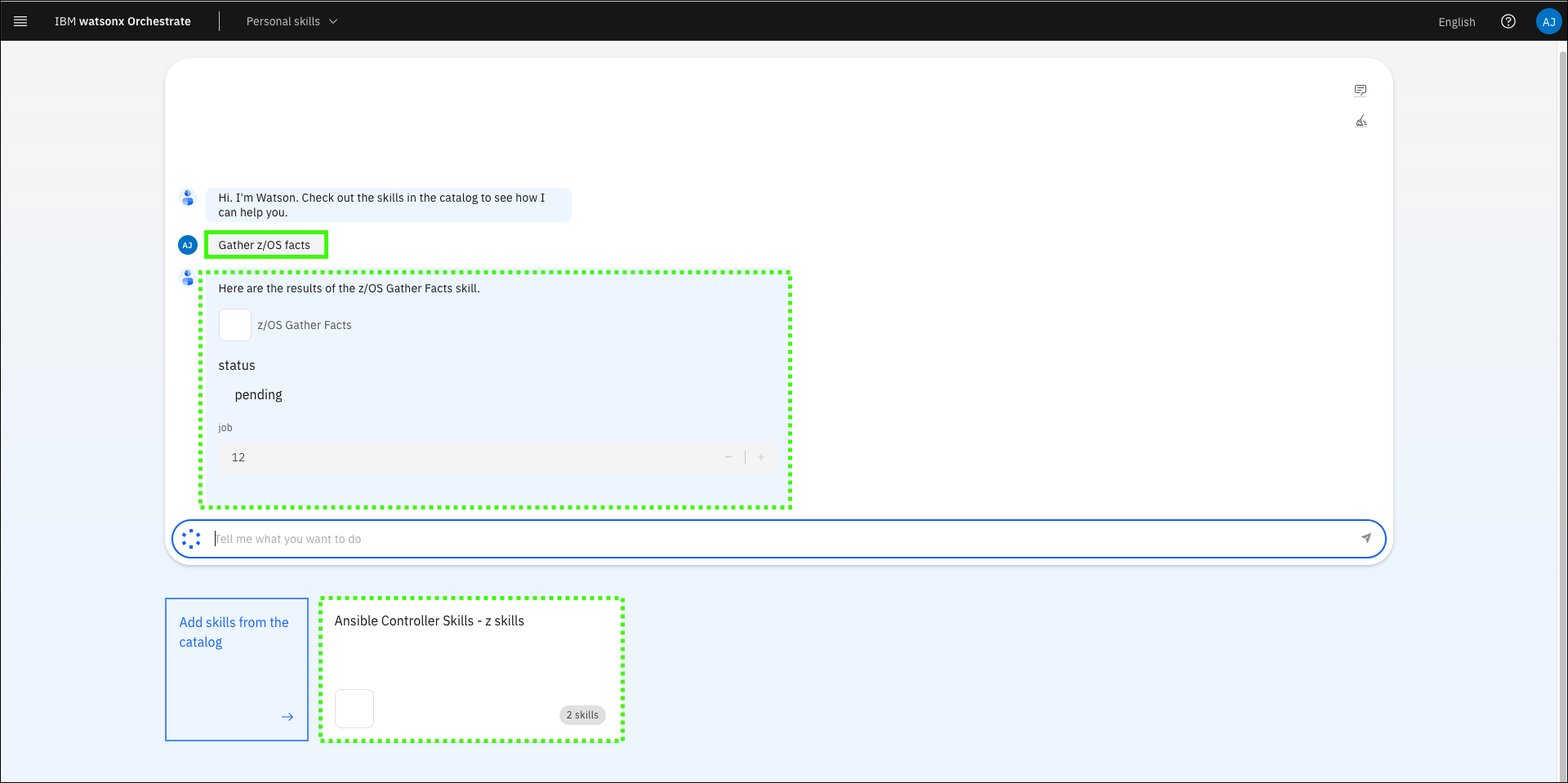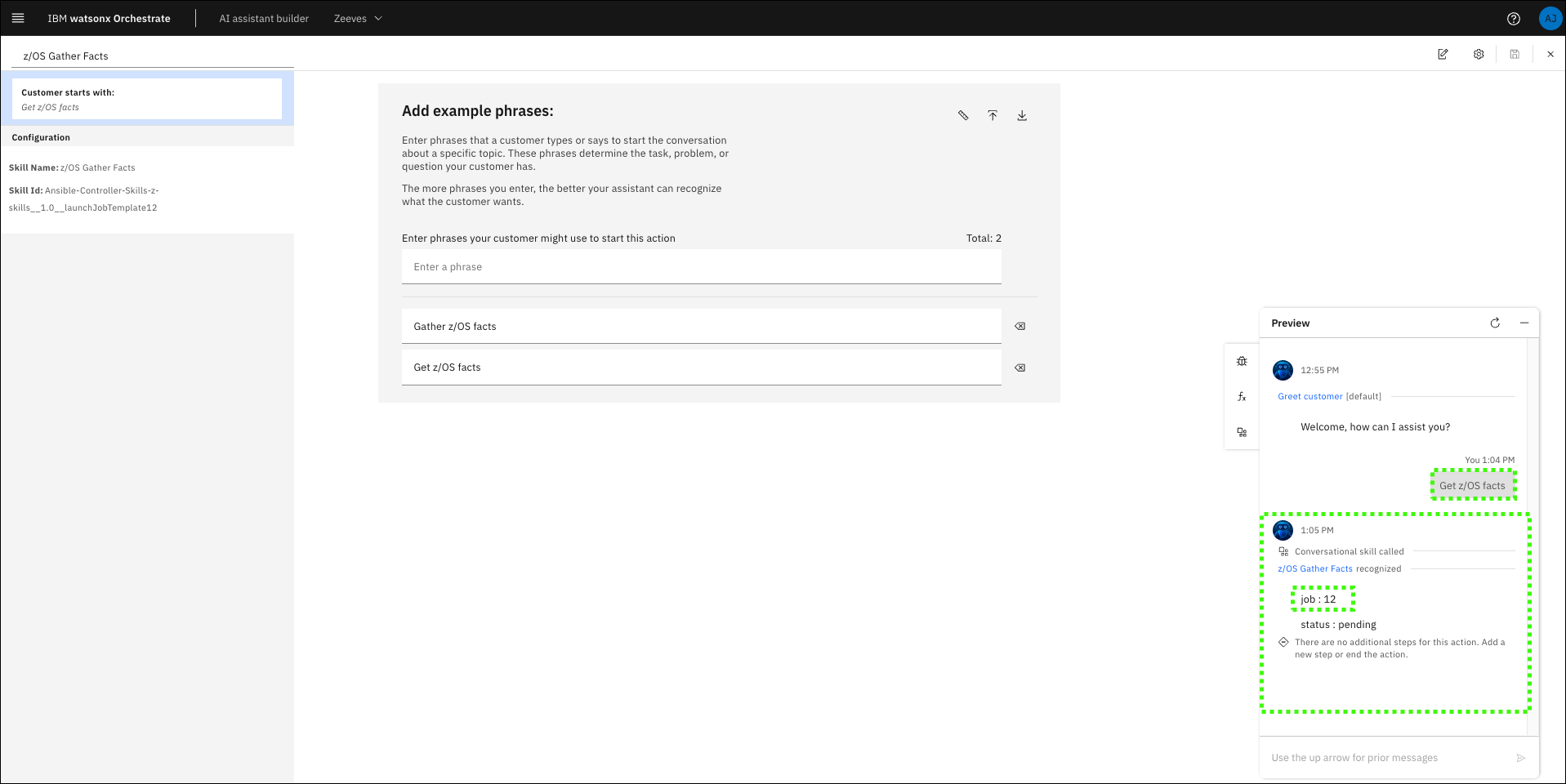 IBM watsonx Assistant for Z provides utility skills to retrieve the job output. It is also possible to create a skill flow that executes the z/OS Gather Facts skill followed by the Retrieve job output utility skill in sequence; passing the job ID from the first skill to the second to view the output within the assistant. Creating a skill flow is covered in the next section.