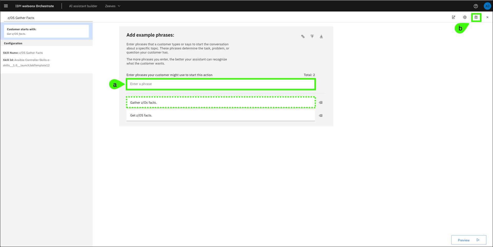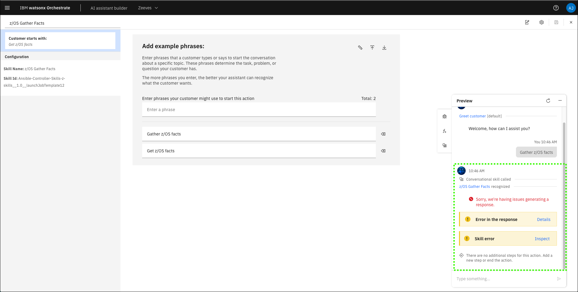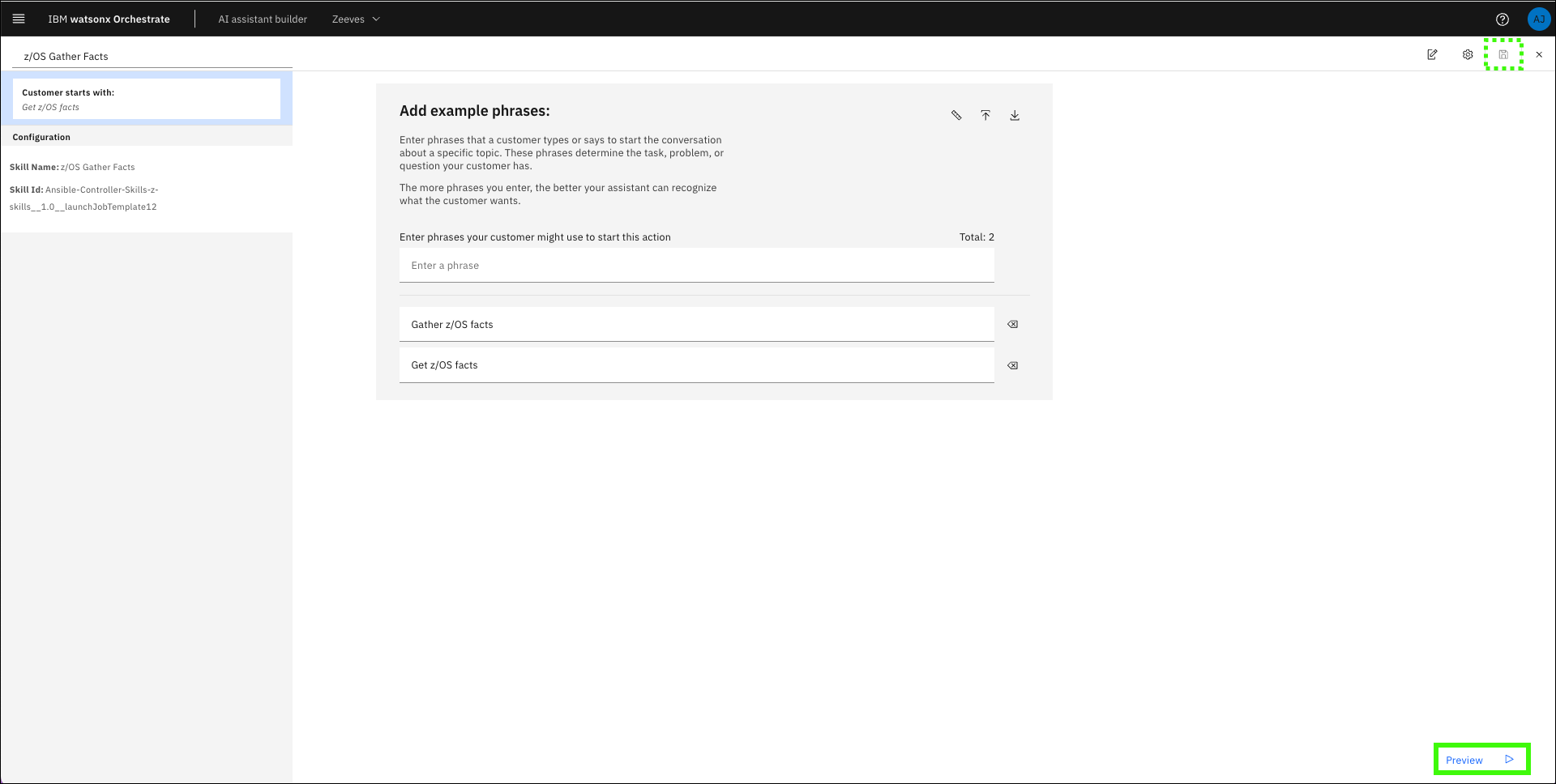 IBM watsonx Assistant for Z provides utility skills to retrieve the job output. It is also possible to create a skill flow that executes the z/OS Gather Facts skill followed by the Retrieve job output utility skill in sequence; passing the job ID from the first skill to the second to view the output within the assistant. Creating a skill flow is covered in the next section.
