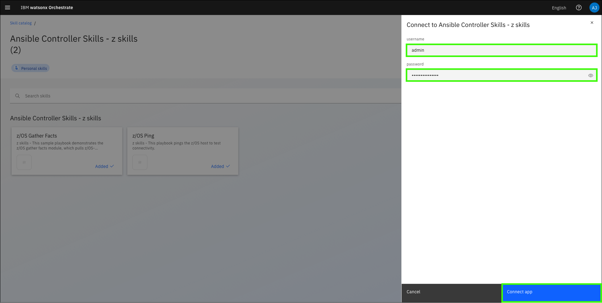 Enter the (a) username and (b) password using the username (admin) and password for your IBM Technology Zone (ITZ) watsonx Assistant for Z Pilot - AAP & z/OS reservation (AAP User Password (Use SSH key to login, only use password for UI)), and then click Connect app.