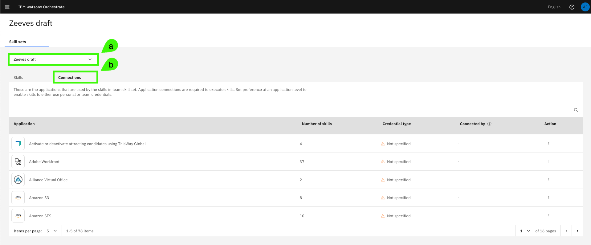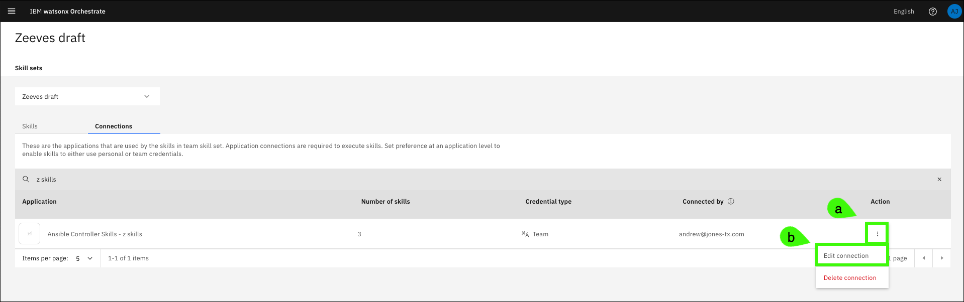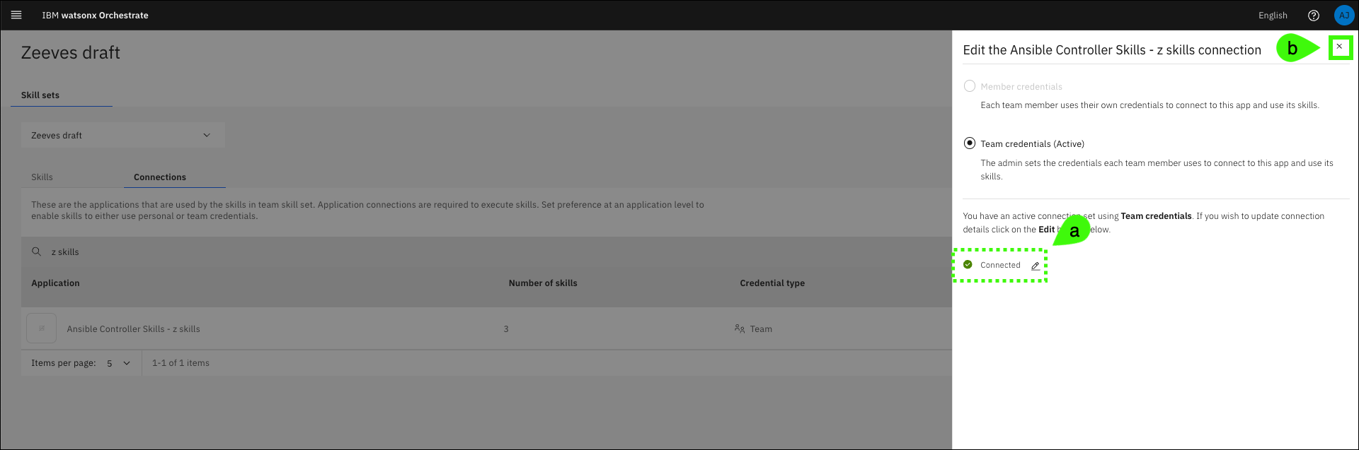 Select (a) your draft assistant in the Team Skills drop-down list and (b) click the Connections tab.