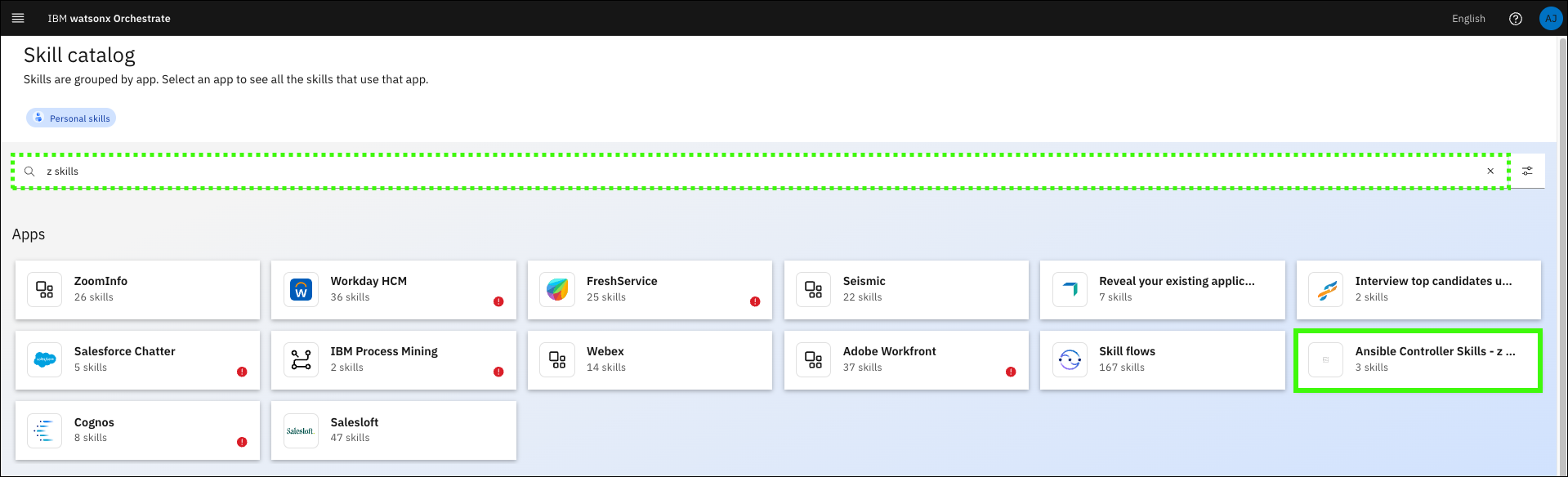 Note, the tile name is proceeded by Ansible Controller Skills.