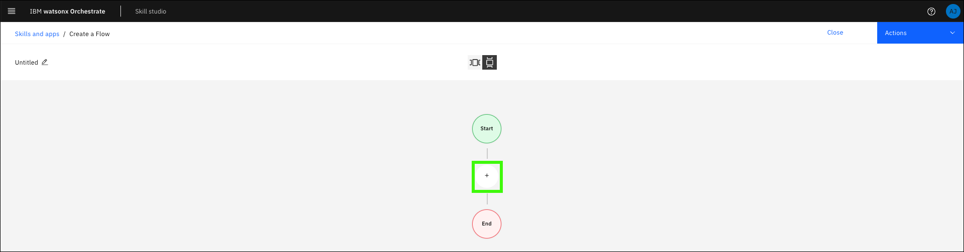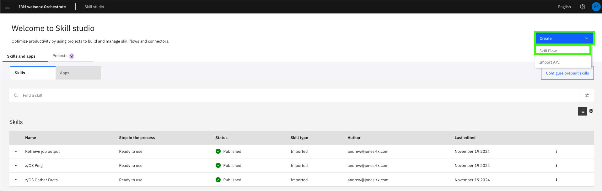 Expand the Create drop-down menu and click Skill flow.