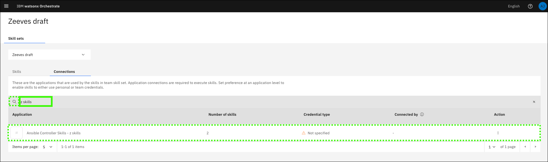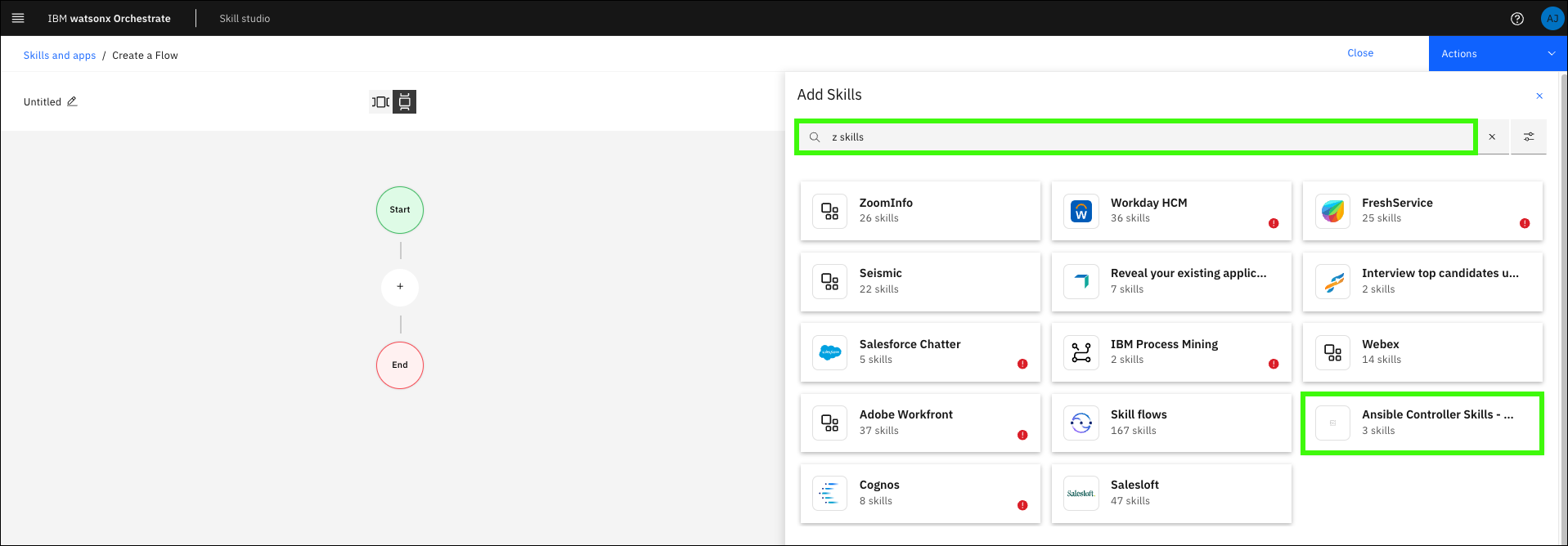 The previous scenario might or might not be relevant for your client's use case. The scenario illustrates how to sequence skills together in a skill flow to create an action that your assistant triggers based on prompts that use the pre-configured Ansible automation templates. You are encouraged to create your own skill flows and prompts that use other skills available within the AAP instance. As an example, create a skill flow for the z/OS Ping skill. Be sure to add the Retrieve job output skill to view the results.
