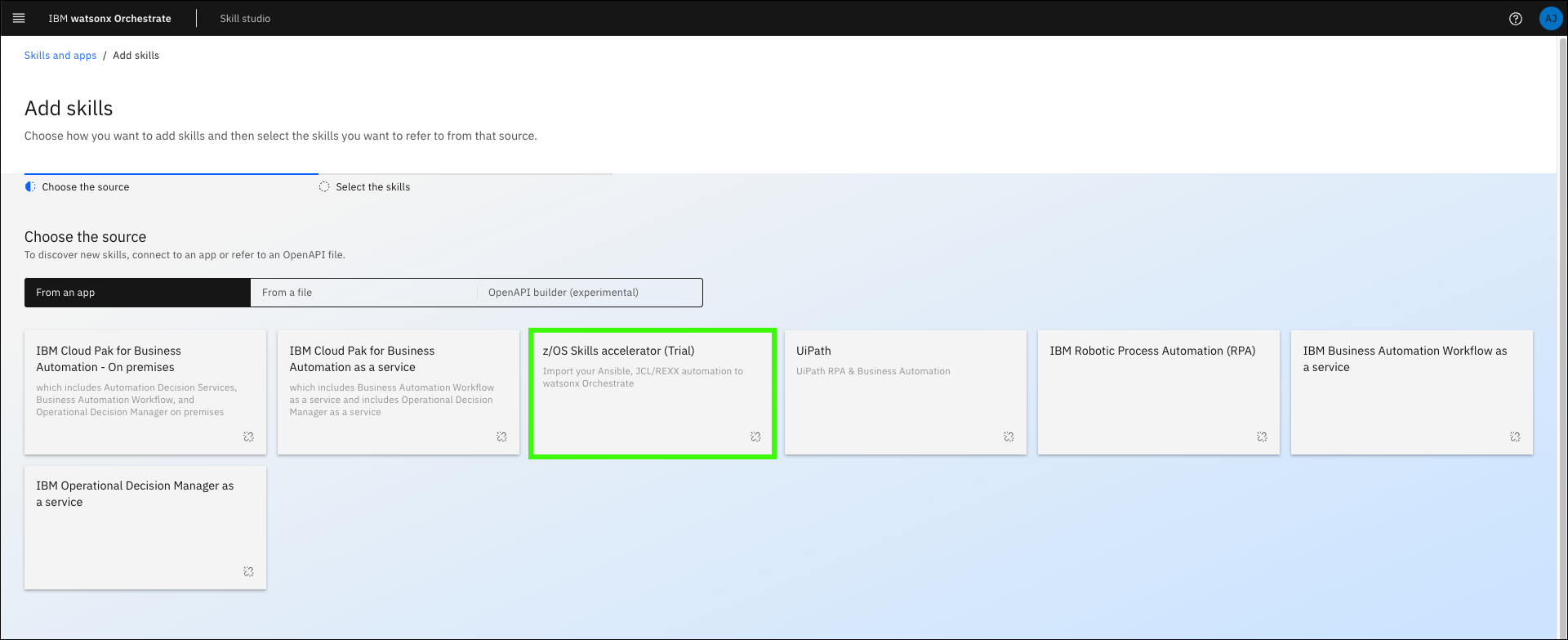 Click the z/OS Skills accelerator (Trial) tile.
