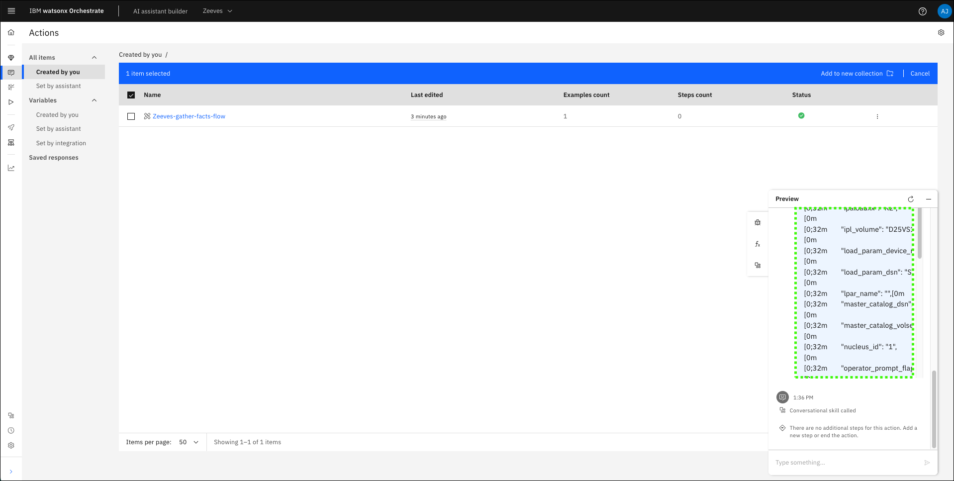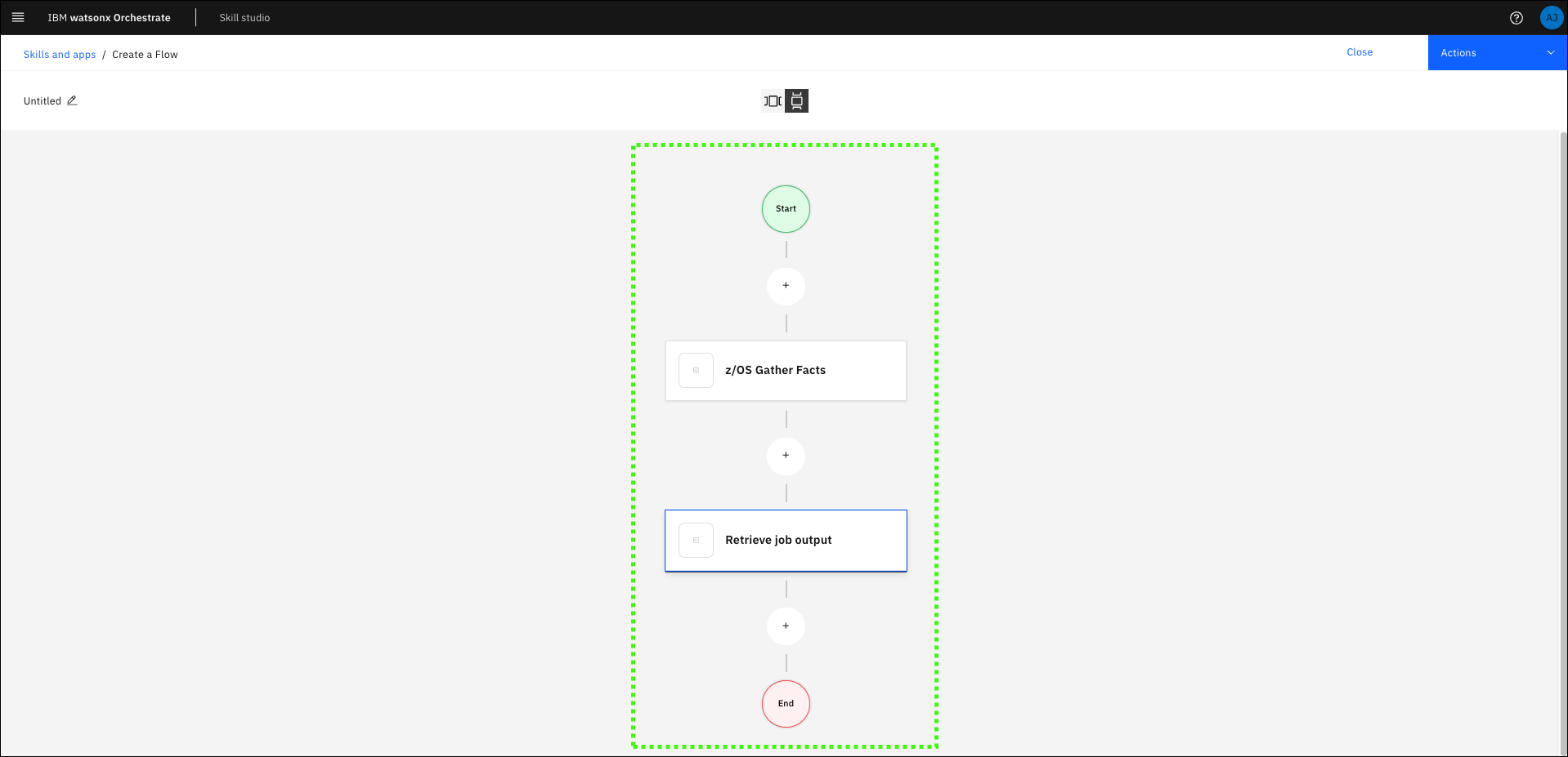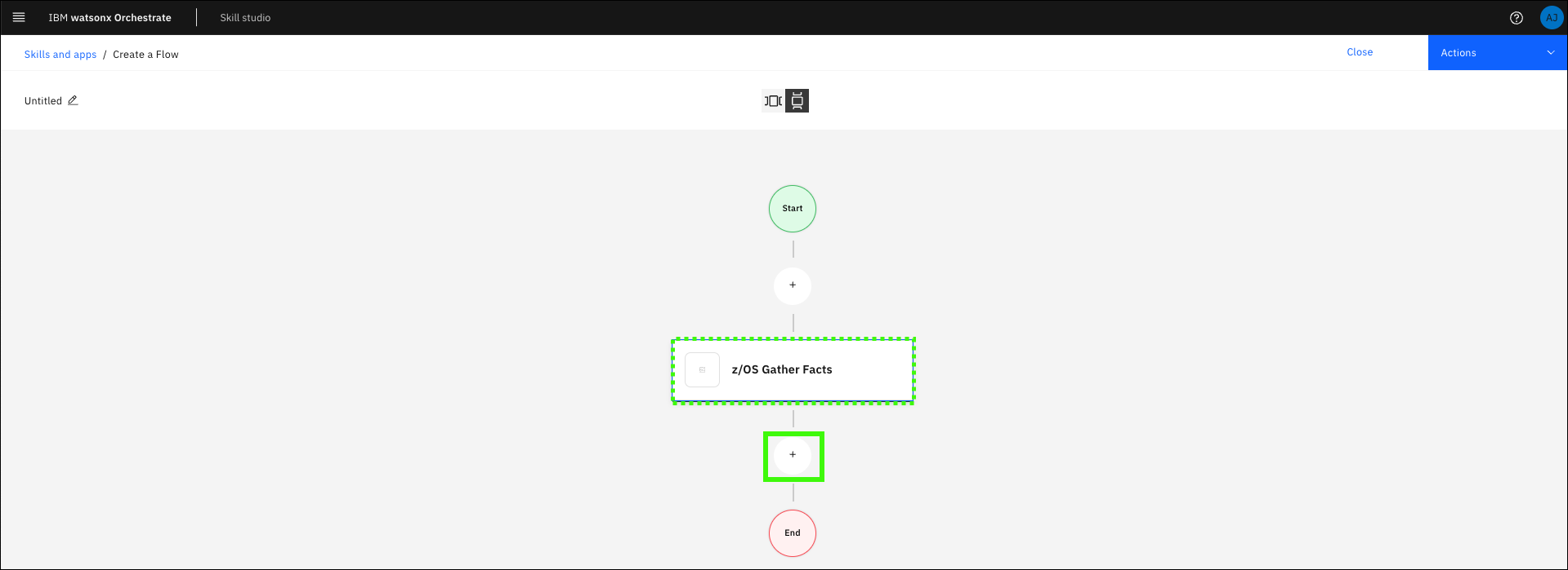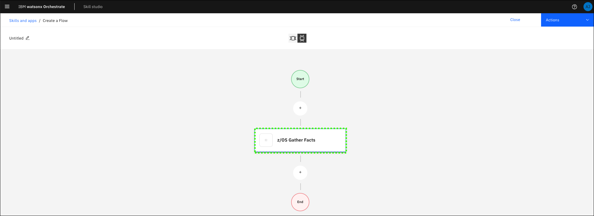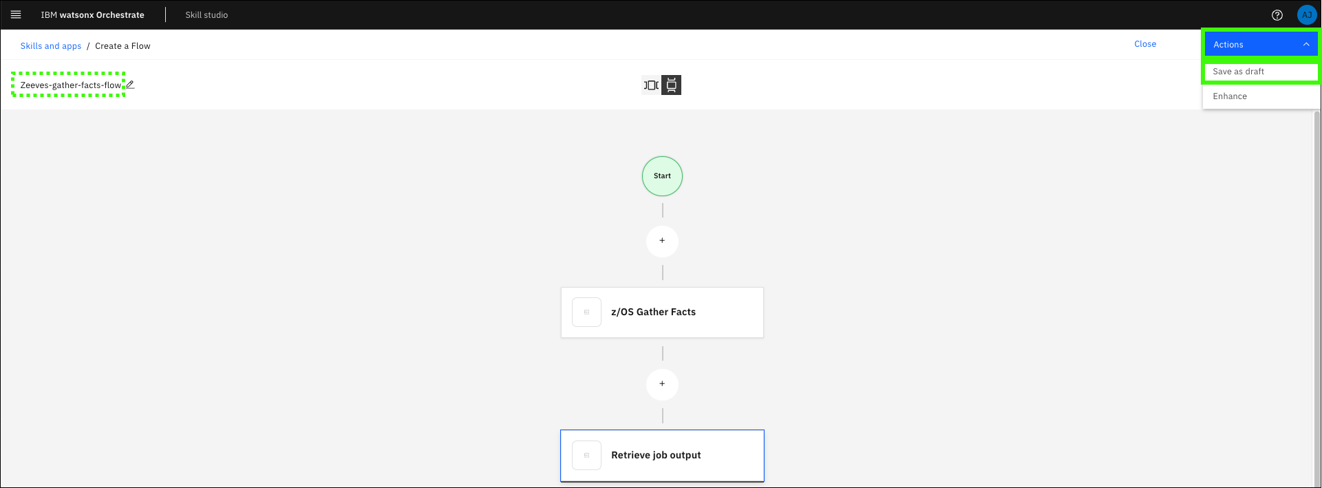 In the previous section, you ran the Gather z/OS facts skill, but the output was not displayed in the assistant. To both run the action and display the results, a skill flow is needed. Skills are often more valuable when combined with other skills. You can create a skill flow to use two or more skills together to finish a task (like returning the output of a previous skill). When you create a skill flow, you map the output of one skill as the input for subsequent skills. Learn more about creating skill flows here.