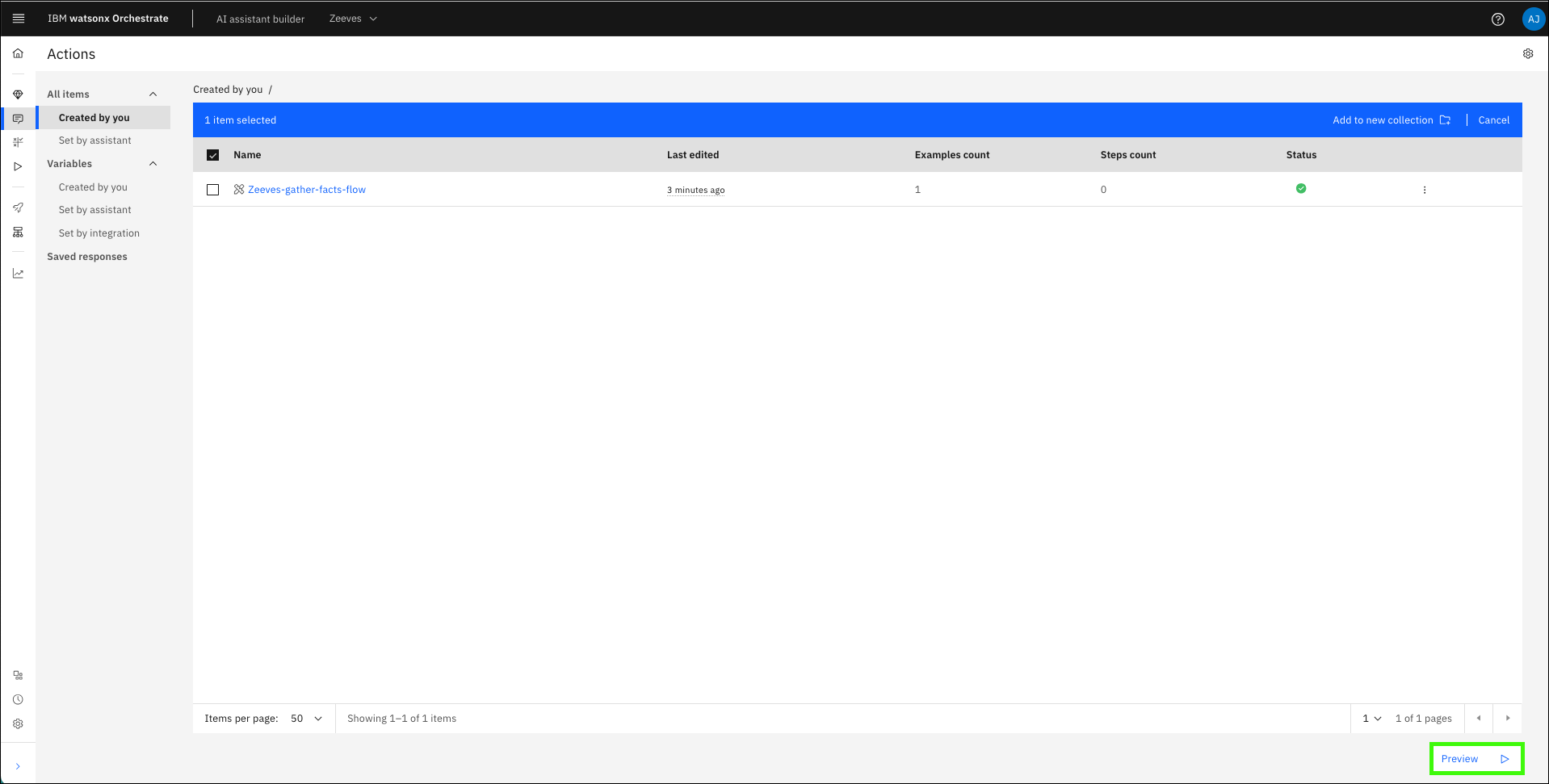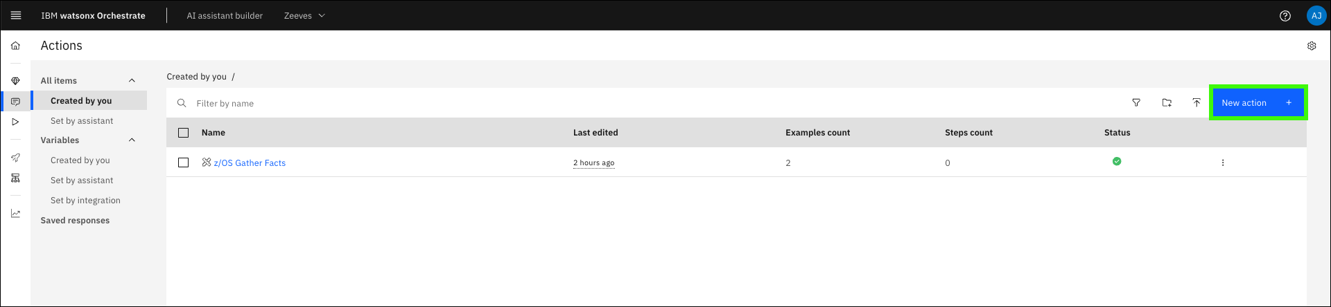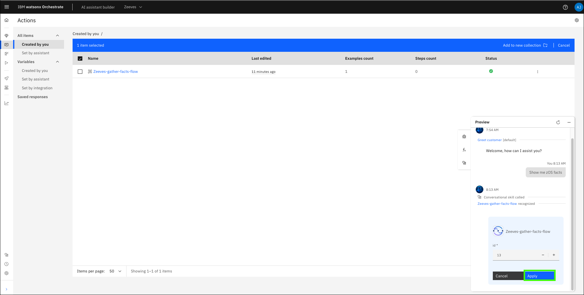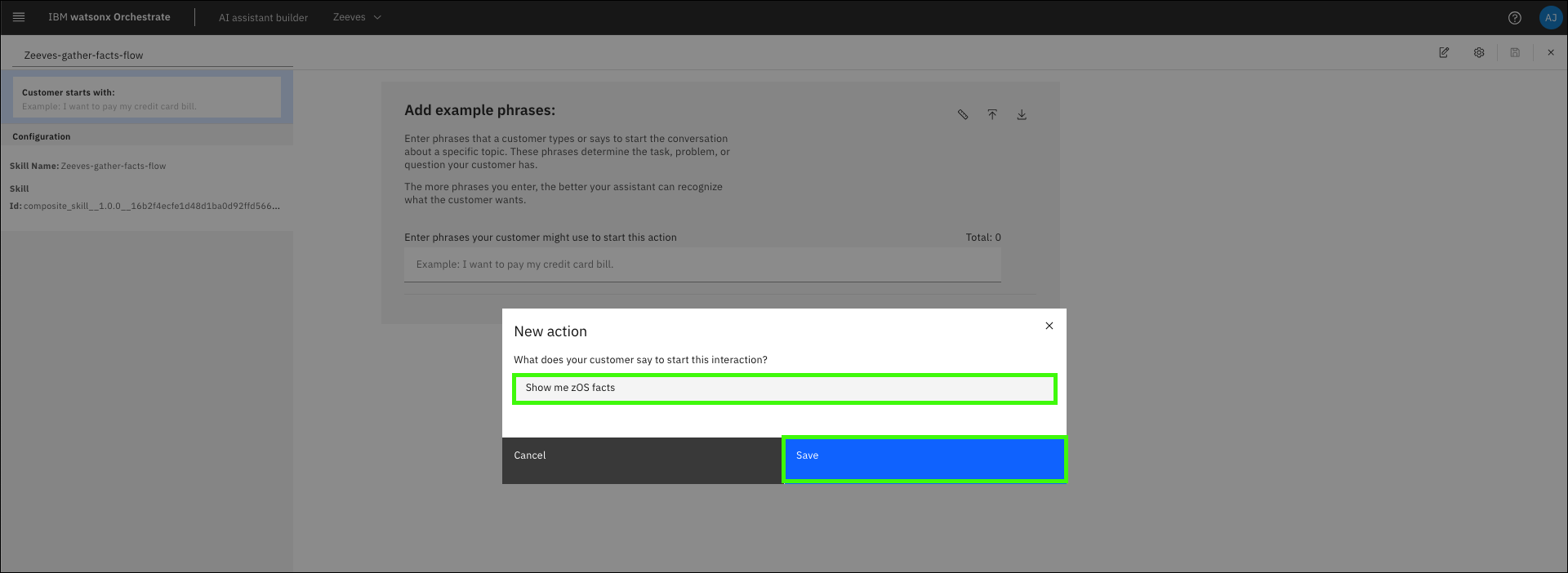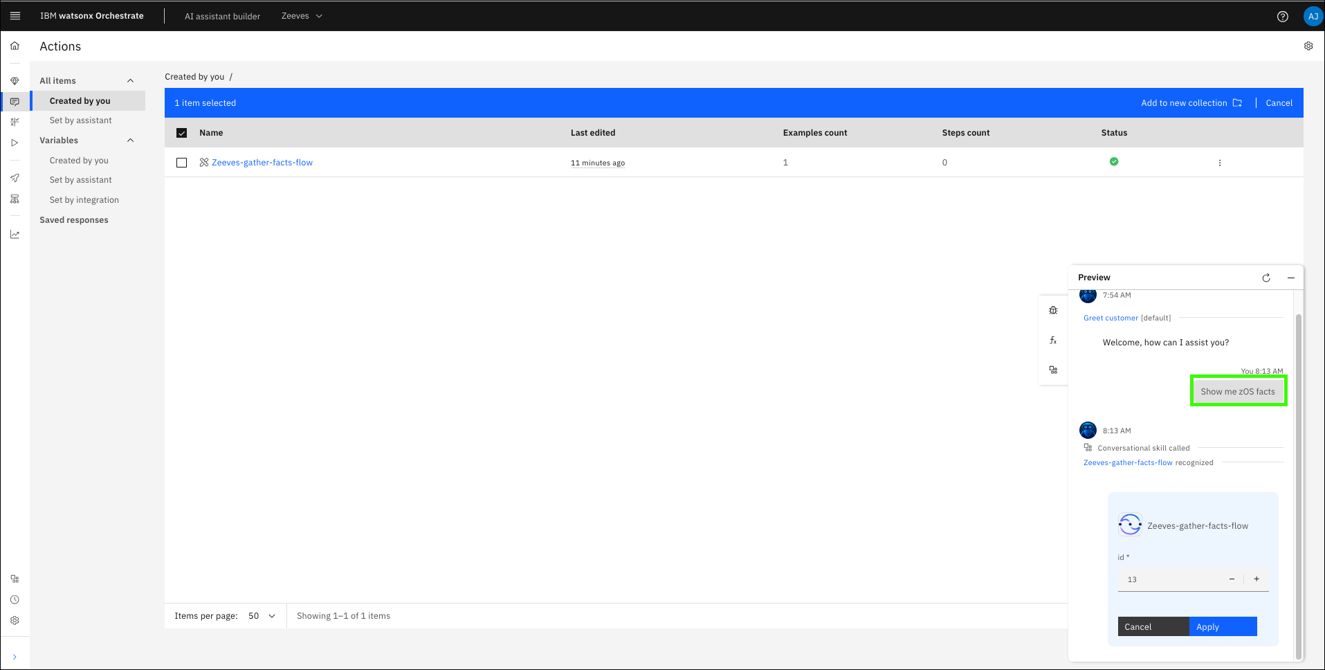 In the previous section, you ran the Gather z/OS facts skill, but the output was not displayed in the assistant. To both run the action and display the results, a skill flow is needed. Skills are often more valuable when combined with other skills. You can create a skill flow to use two or more skills together to finish a task (like returning the output of a previous skill). When you create a skill flow, you map the output of one skill as the input for subsequent skills. Learn more about creating skill flows here.