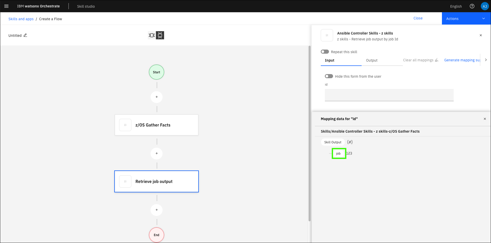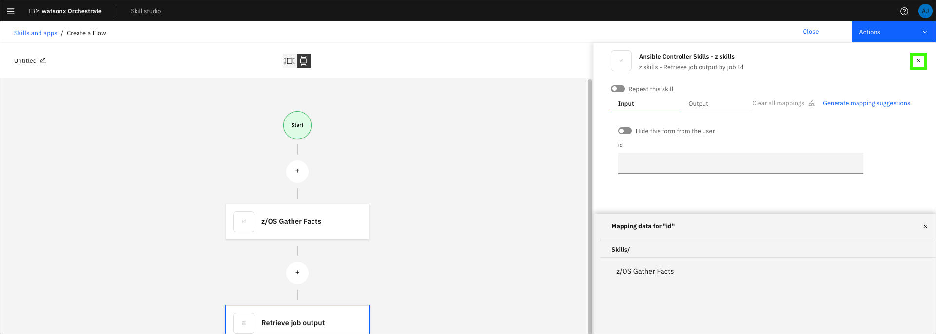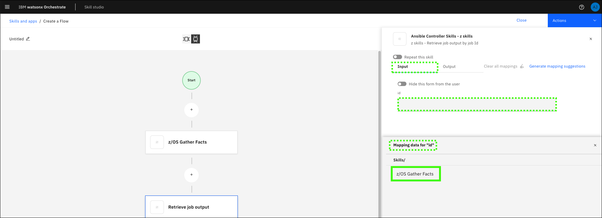 Next you must map the output values of the first skill to the input of the second skill. In this case, pass the job ID output from z/OS Gather Facts as an input for Retrieve job output.