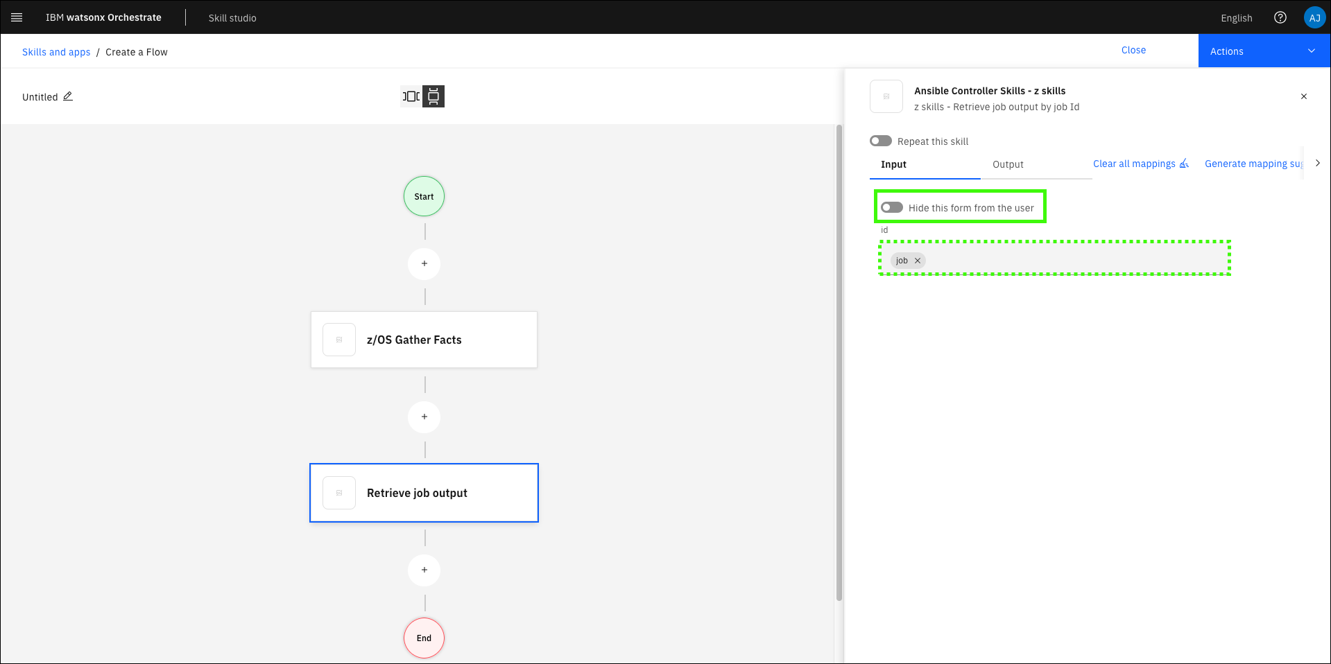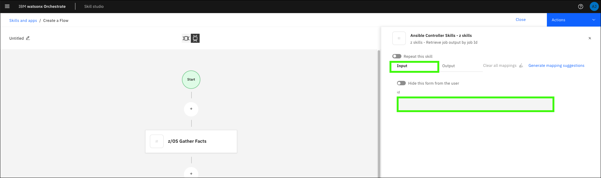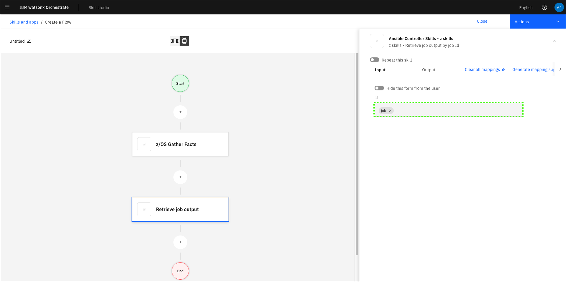 Next you must map the output values of the first skill to the input of the second skill. In this case, pass the job ID output from z/OS Gather Facts as an input for Retrieve job output.