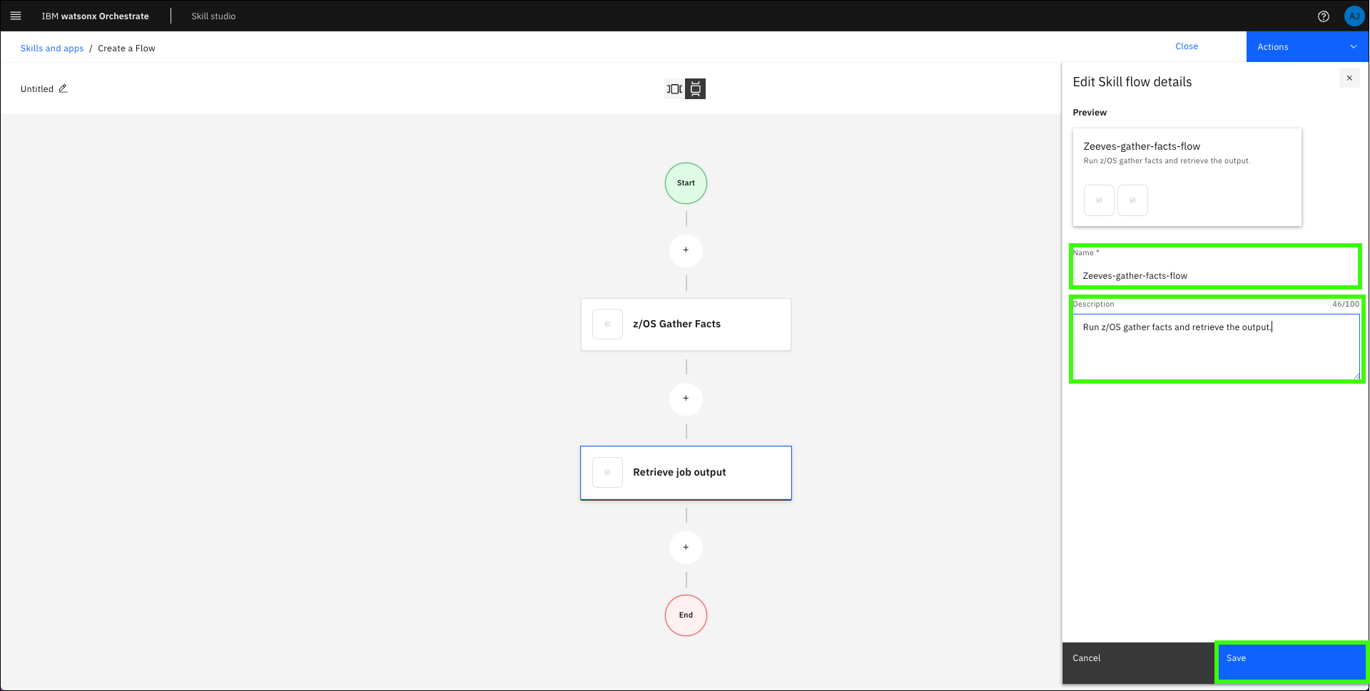 Verify the z/OS Gather Facts skill is added to the skill flow.