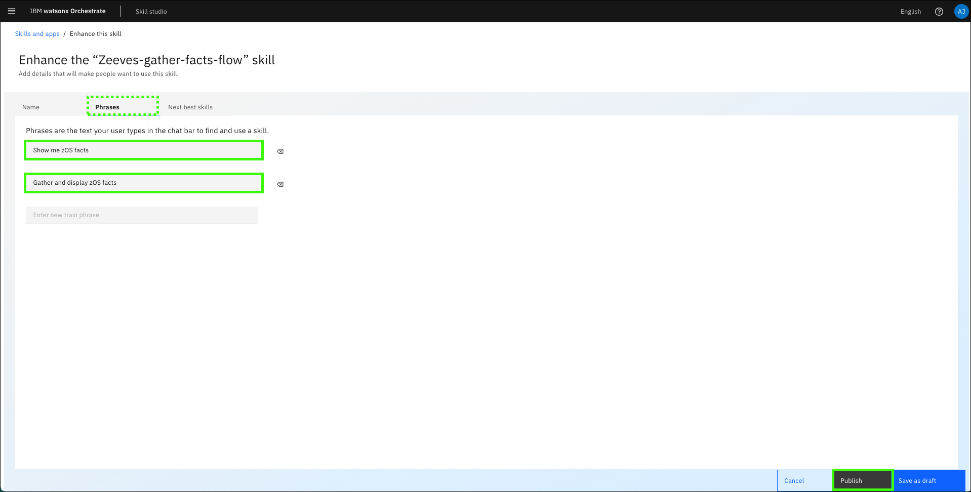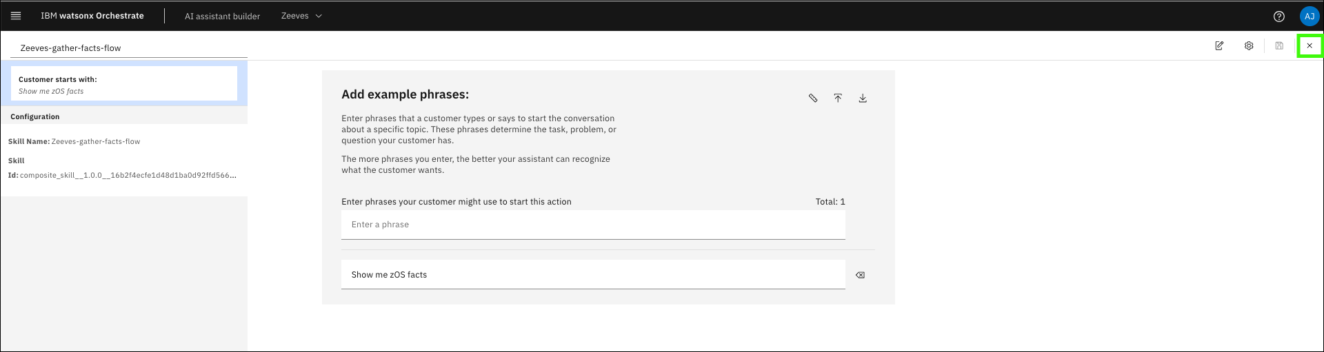 Notice that the default prompts are either not intuitive (the skill flow name) or a bit verbose. Replace the existing phrases with phrases that you anticipate users will use.