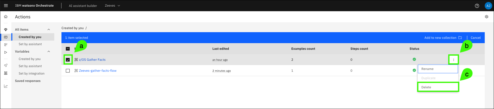 Select the original skill that you created (a) (not the skill flow you just created), click the ellipses (b), and then click Delete (c).
