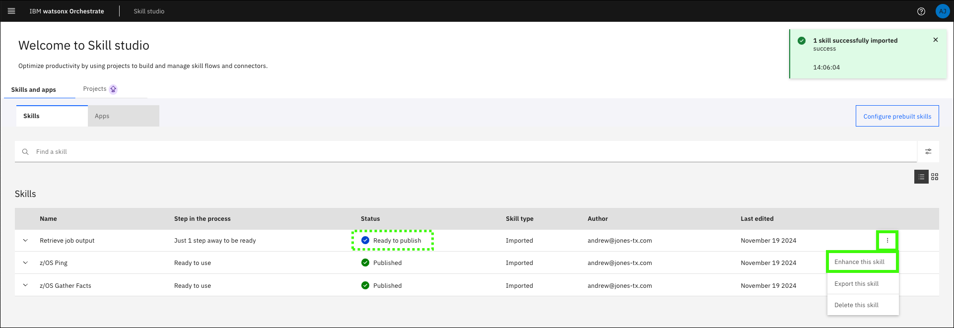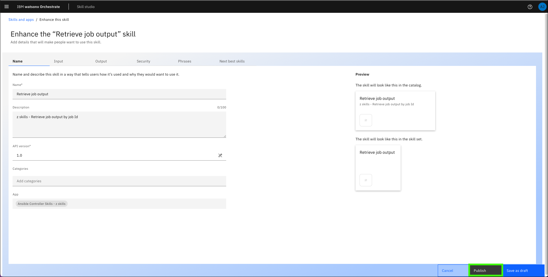 ) for the Retrieve job output skill and select Enhance this skill. -