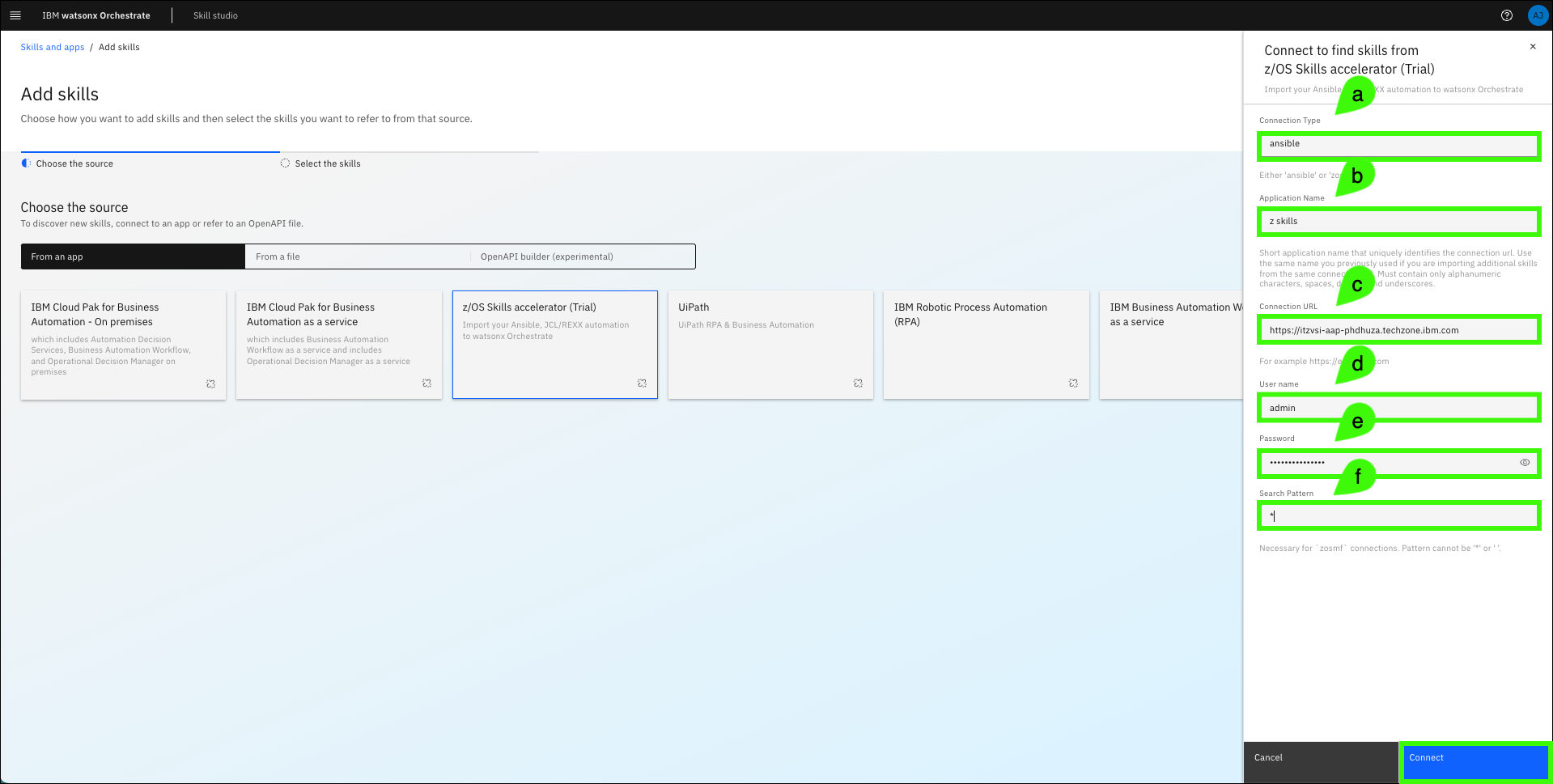 Enter the following values in the z/OS Skills accelerator form and then click Connect.
