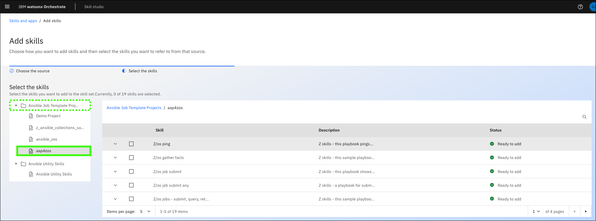 For this lab, select the Z/os ping and Z/os gather facts skills.