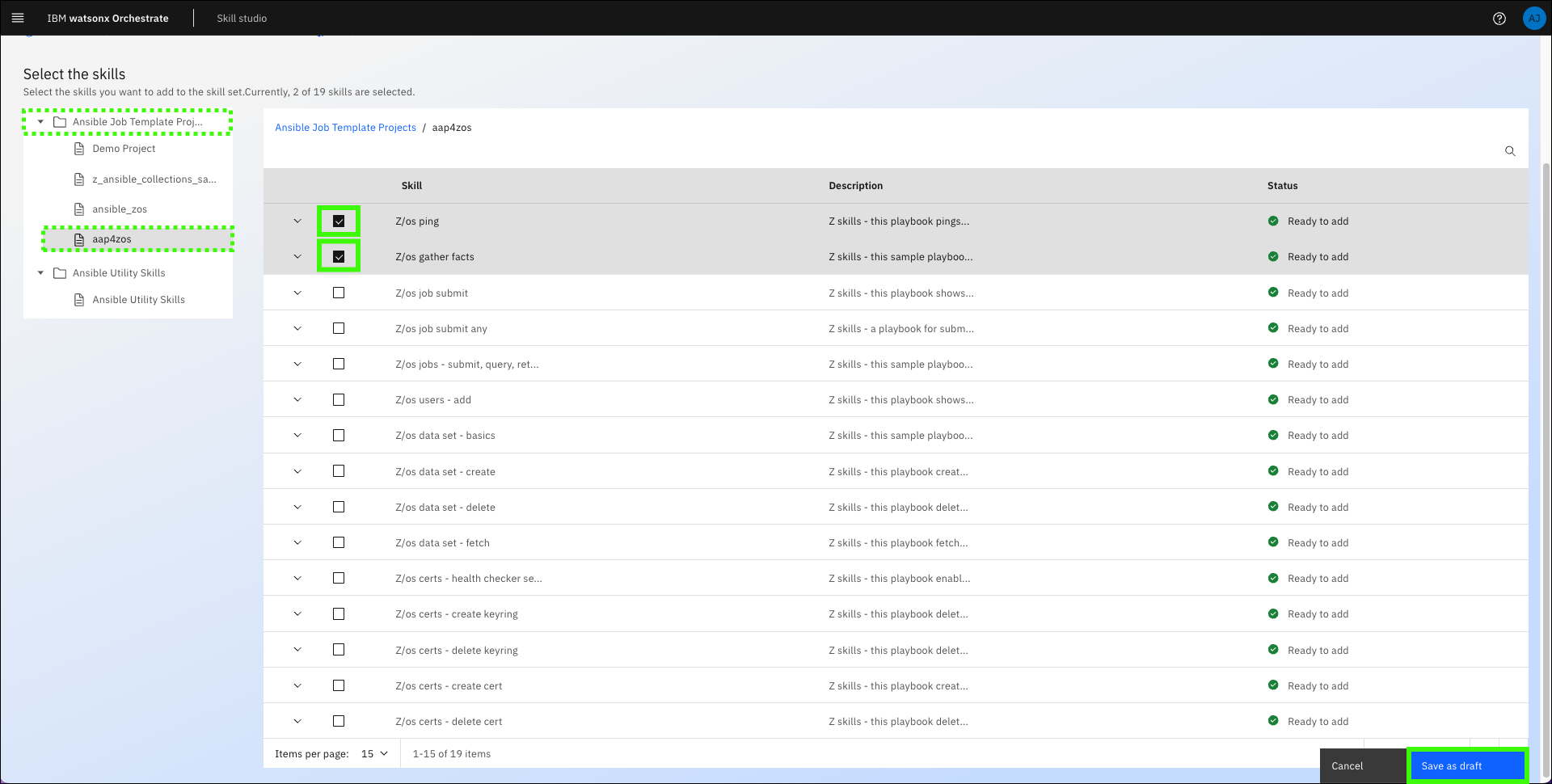 Select the skills that you want to import into your application and then click Save as draft.