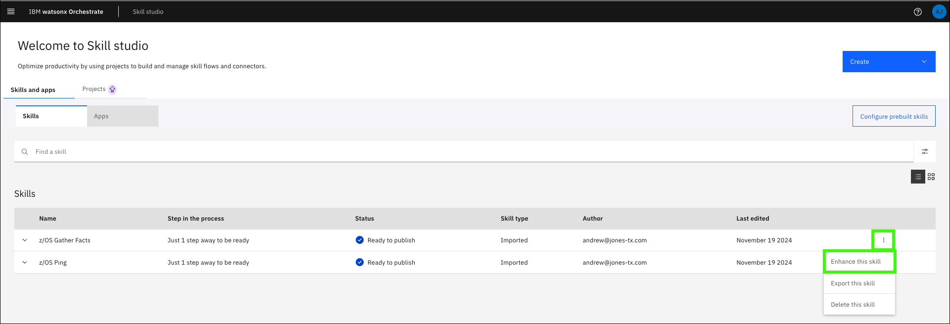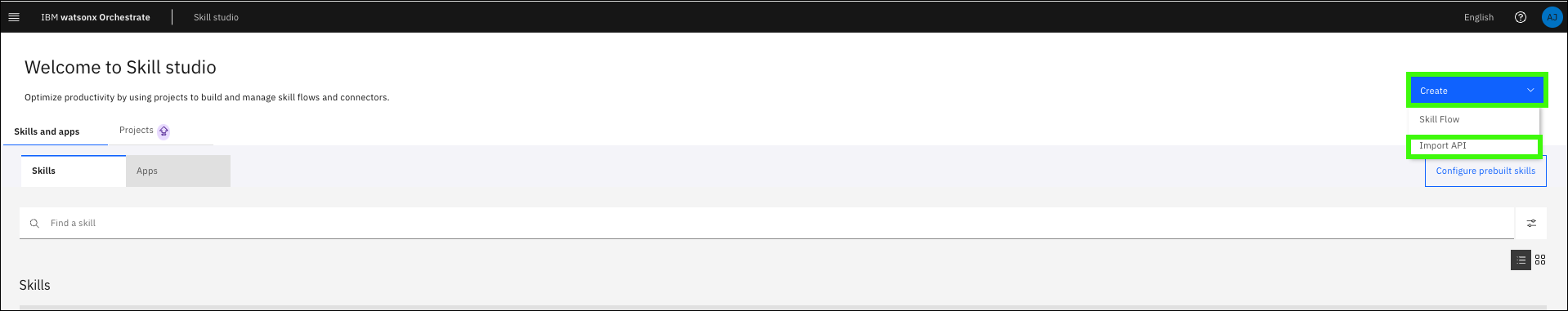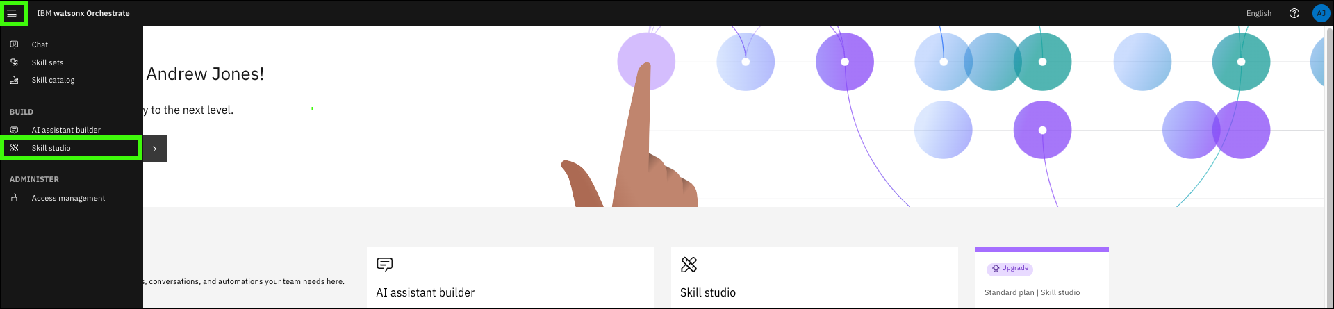 Return to your watsonx Orchestrate instance and expand the main menu and click Skill studio.