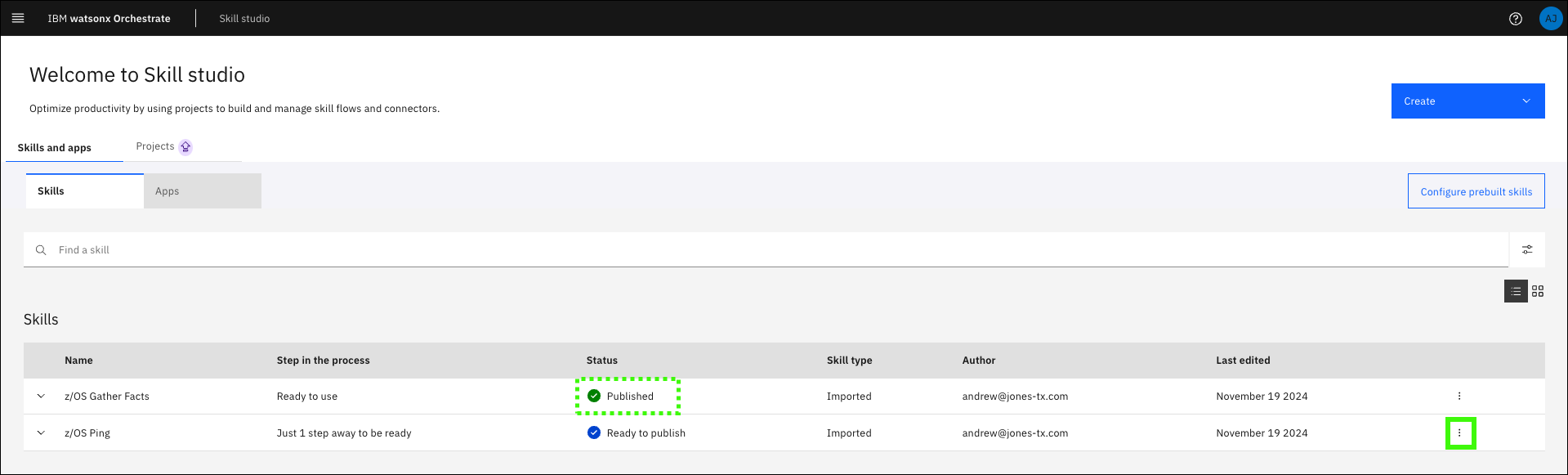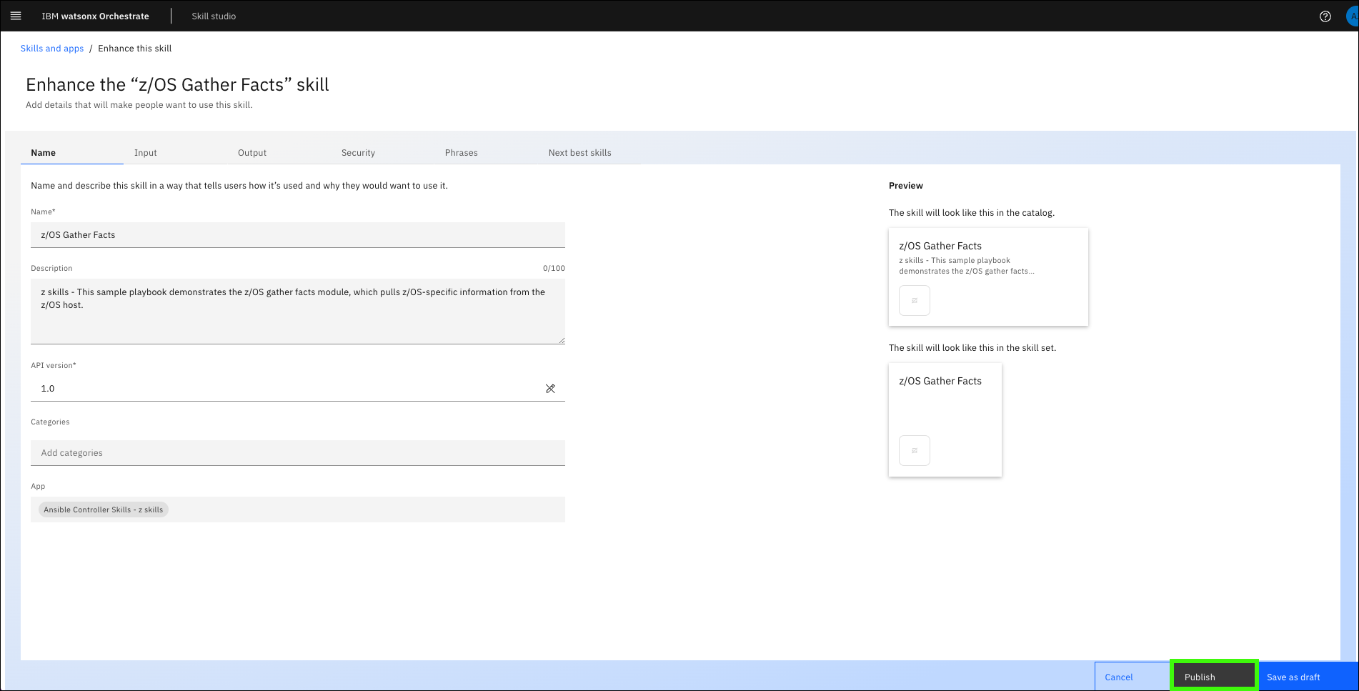 Take time to explore the available skills. There are many utility skills provided out of the box with the “Z Skills Accelerator” which are needed for actions such as retrieving the output of an Ansible skill. Consider importing these utility skills to enable more complete automation execution flows.