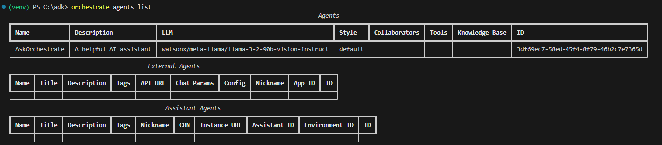 agents list コマンドでインポートされたエージェントを確認してみましょう。