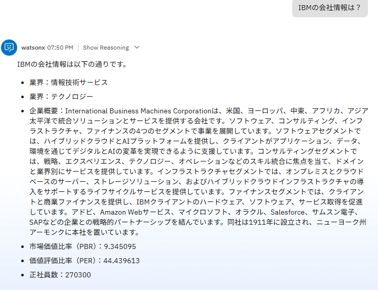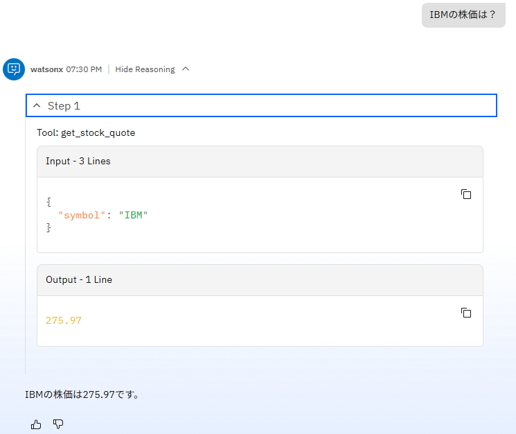 チャット入力欄に、「IBMの株価は?」と入力してみましょう。ツールが呼びだされ、株価が表示されるはずです。 Show_Reasoningをクリックして展開し、Toolの呼び出し結果を確認してみましょう。
