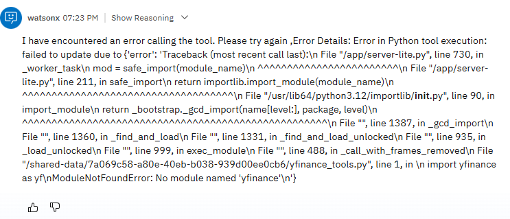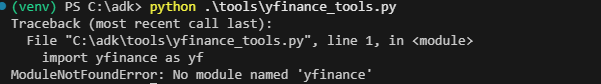 エラーが返ってくるはずです。これは、この環境にyfinanceというPythonのモジュールが未導入のため発生するエラーです。ツールを実装する際には、Python単体で動作するのか、watsonx Orchesrateの環境に問題があるのかを切り分けるためにもまずは単体での動作確認をすることをお勧めします。python .\tools\yfinance_tools.py