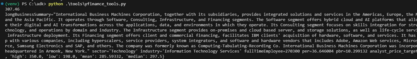 今回は、以下のように、IBMの株価や会社情報が表示されたはずです。pip install yfinance python .\tools\yfinance_tools.py