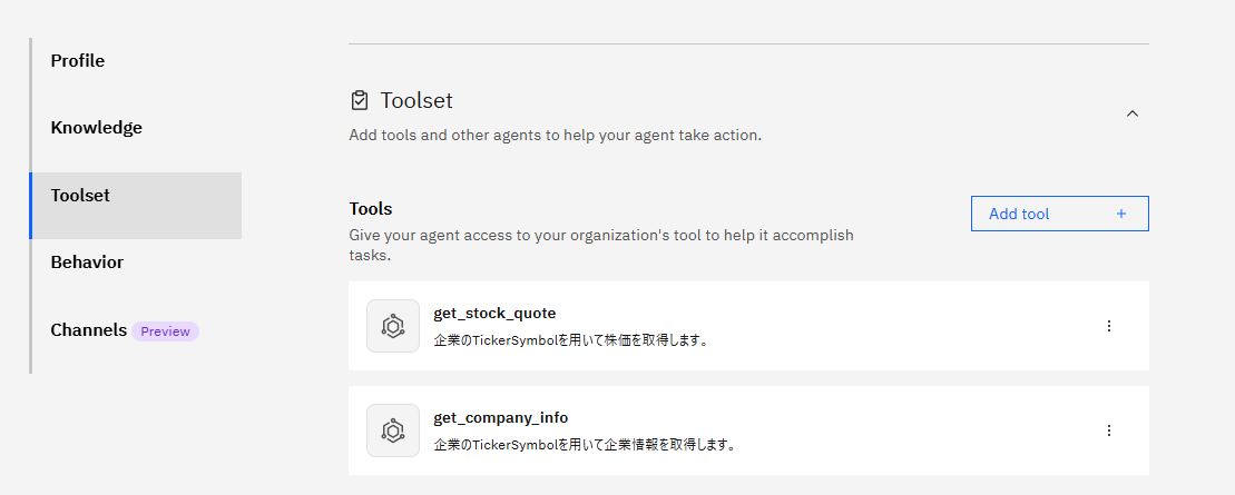 インポートしたツールをエージェントから実行してみましょう。AgentBuilderを用いてfinance_agentにツールを追加することもできますが、今回はADKを用いて追加をしてみます。