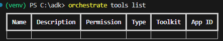 orchestrate env activate local - ツールの一覧をtools listコマンドで確認します。