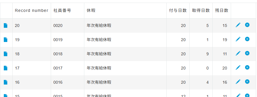 ご自身のデータに対し、休暇申請処理(休暇申請アプリの残日数データを更新)することができるようになっていれば、完成です。