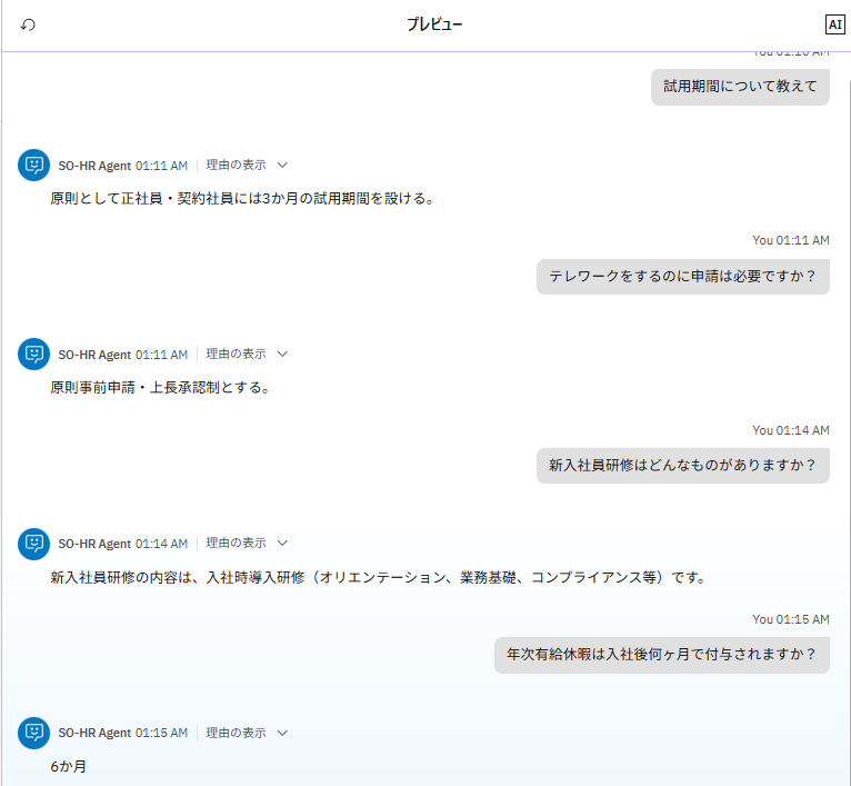 サンプル人事規則に記載されている内容を元にした、たとえば以下のような質疑応答ができるようになっていれば、完成です。