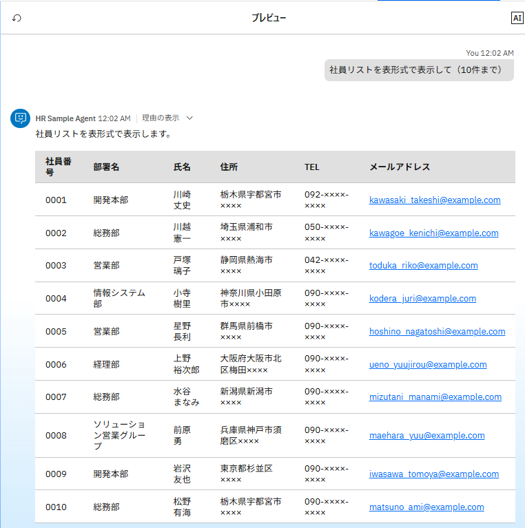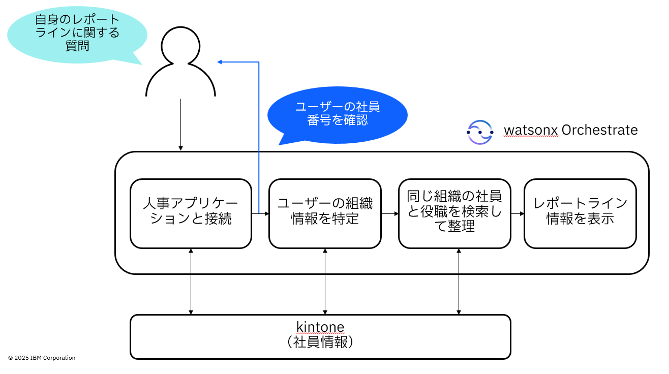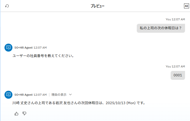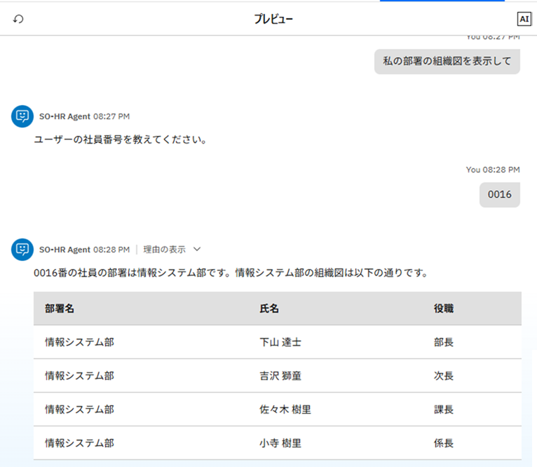 ※今回利用するツールは個人認証を行わないため、特定ユーザーの組織情報を取得するためには対象のユーザーの社員番号を AI エージェントに連携します。