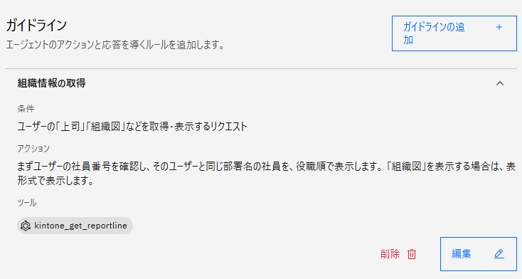 - 対象ユーザーと同じ組織の情報を上手く出力できない場合は、組織情報について聞かれた際のデータの検索方法を Behavior(動作)あるいは Guidelines に示します。