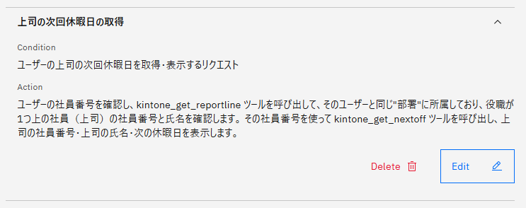 先ほど実装した組織情報を利用し、自身の上司の次回休暇予定を確認できるよう設定していきます。 特定社員の次回休暇情報を取得するツール kintone_get_nextoff を追加し利用してください。