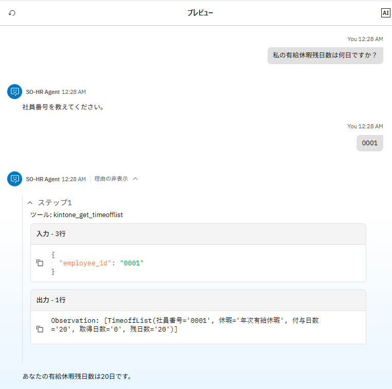 Step1: ユーザーの社員番号を確認して、kintone_get_timeofflist ツールを呼び出し、有給休暇の残日数を回答します。