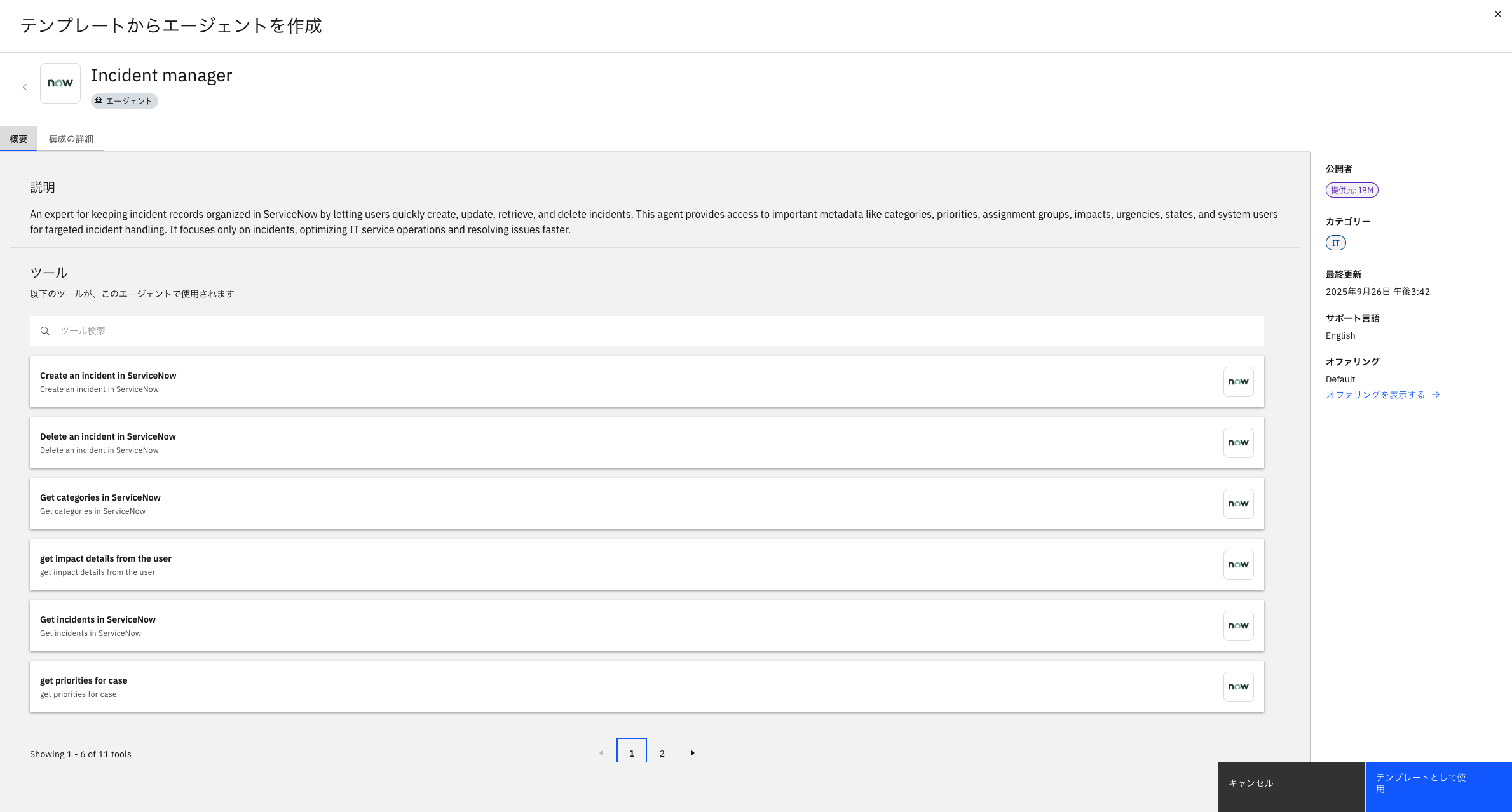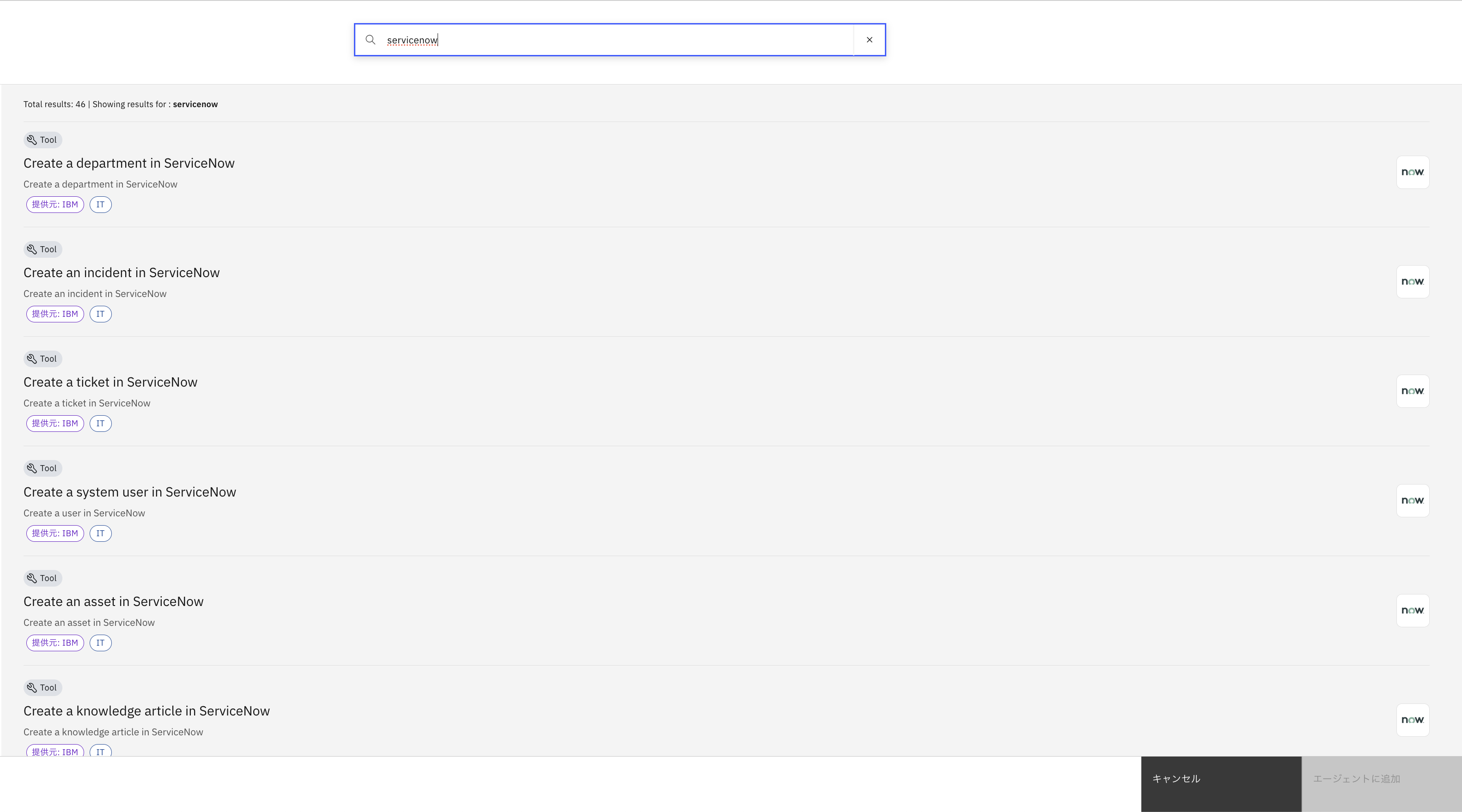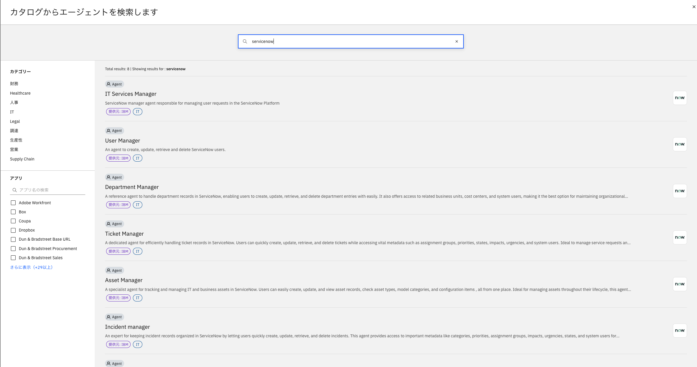 watsonx Orchestrateでは人事や調達、ITといった業務領域に特化した事前構築済みエージェントを提供しています。ServiceNowと連携するエージェントも用意されているので、まずはそちらを試してみます。