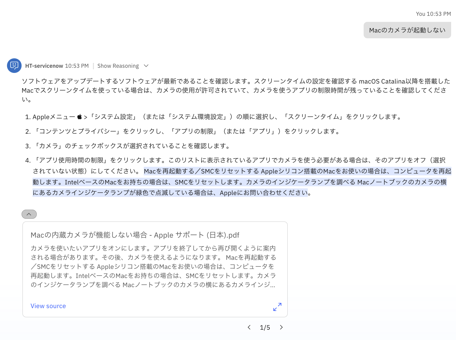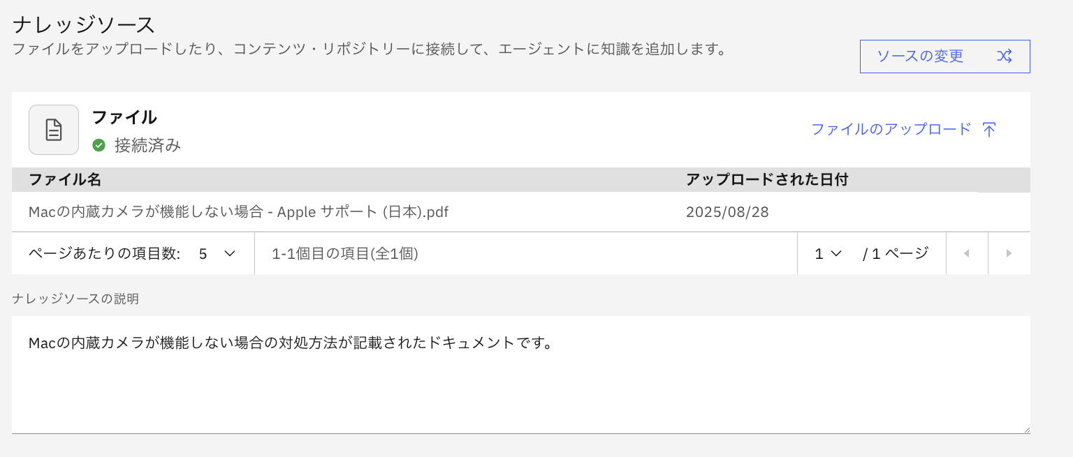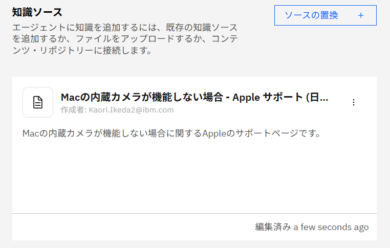 ナレッジソースはMacのサポートページを使用しました。Webページをpdf化してwatsonx Orchestrateにアップロードしています。ここは好きなドキュメントに差し替えたり、新たに別のドキュメントを追加して試してみてください。