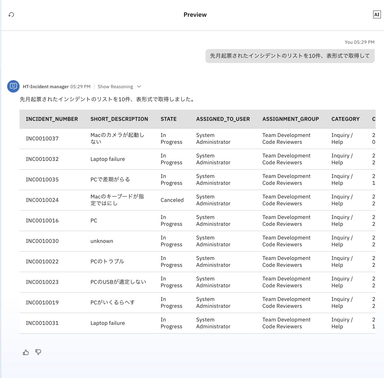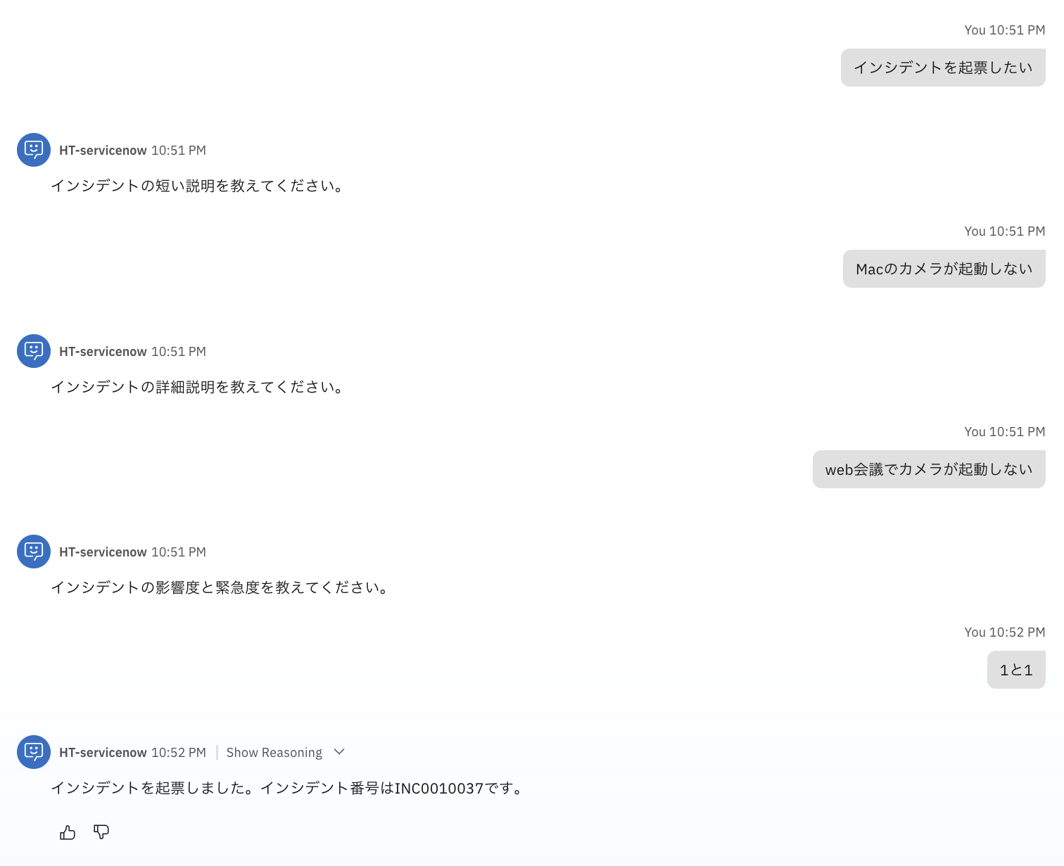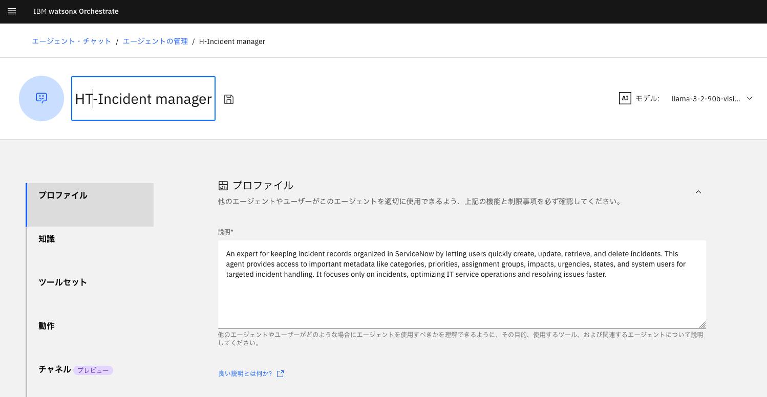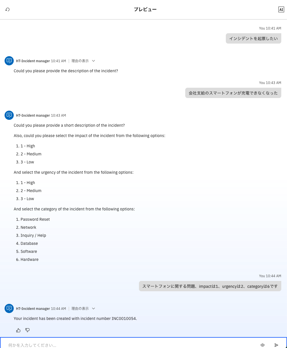 まずはインシデントを起票してみてください。 以下の例ではテンプレートの指示が英語で書かれているため、英語で回答してしまっていますが、インシデントが起票できています。モデルはllama-3-2-90b-vision-instruct、エージェントスタイルはReActにしています。