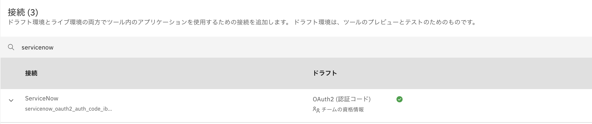 3. 検索ボックスに、servicenow と入力してください。servicenowが名称に含まれるいくつかの接続設定が表示されます。本ハンズオンでは事前に接続定義済みなので変更は必要ありません。
