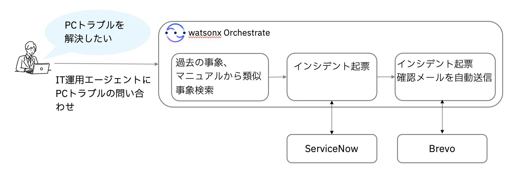自然言語での問い合わせ受付→過去の障害ログ・ナレッジベースから類似事例を検索、解決方法を提示→ServiceNowへインシデント起票