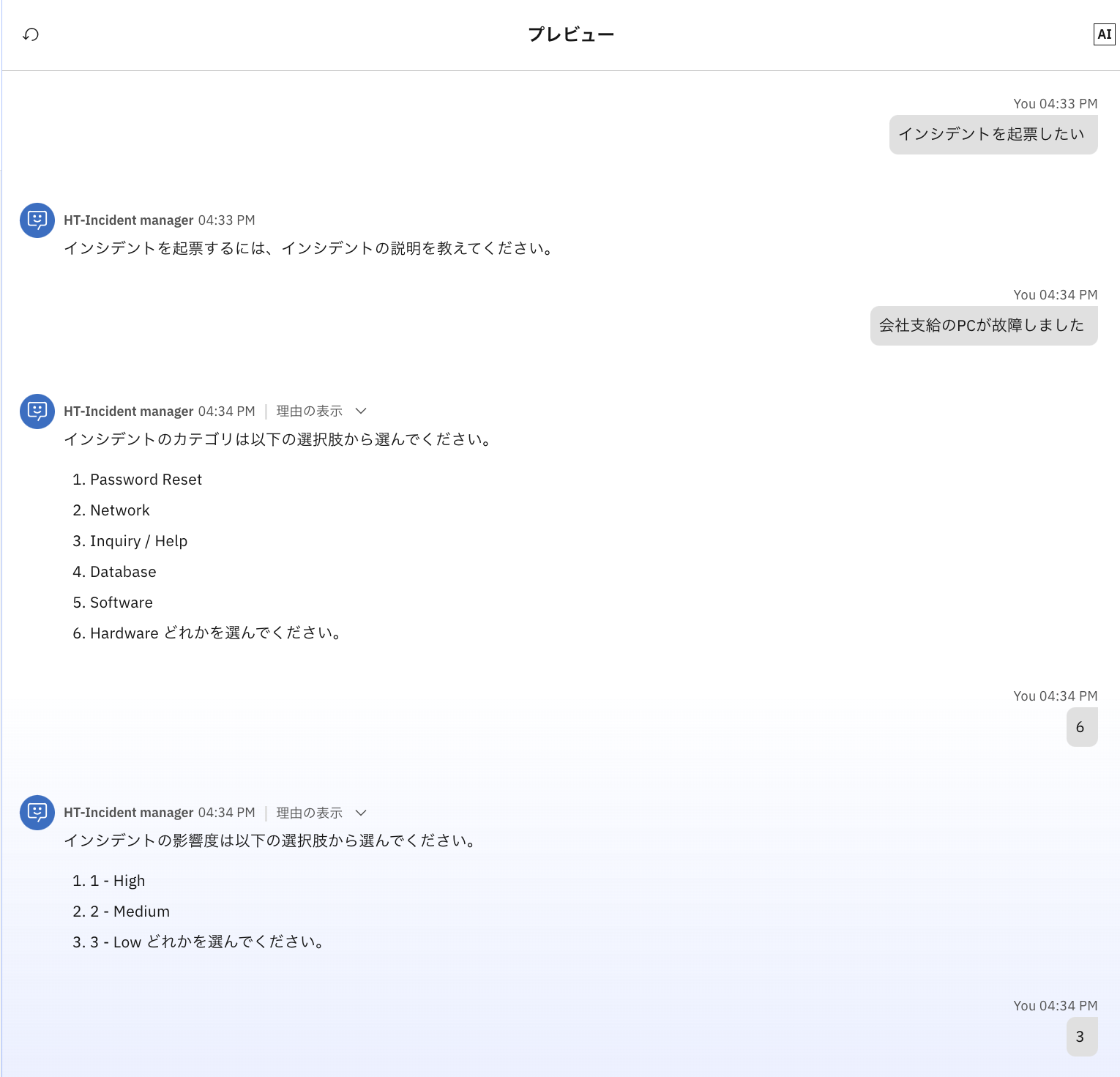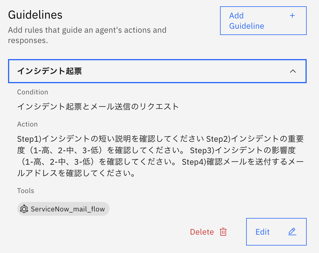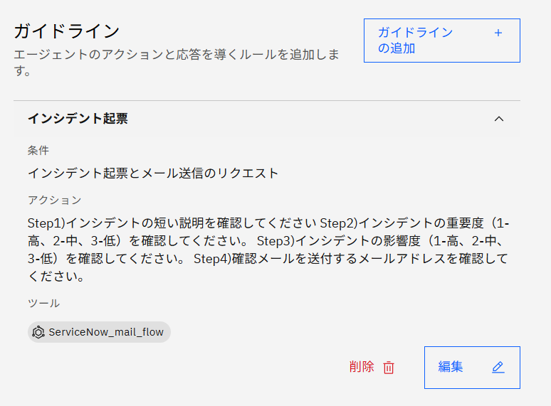 Guidelineにフローを呼び出す際のステップをGuidelineに記述しています。これを記述しなくても動作しますが、インシデント起票に必要な情報をエージェントに与える際の順番を明示的に指定しています。