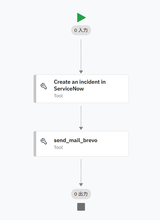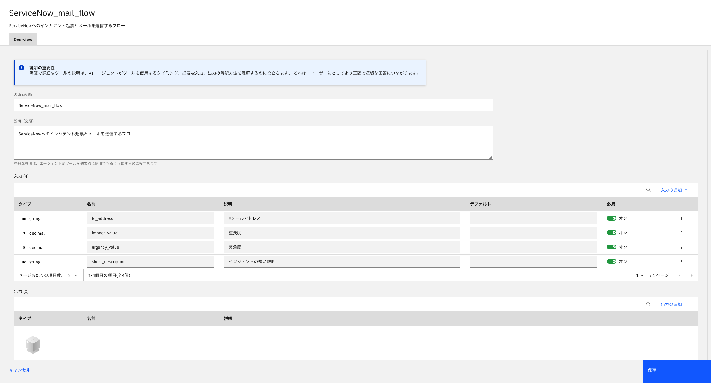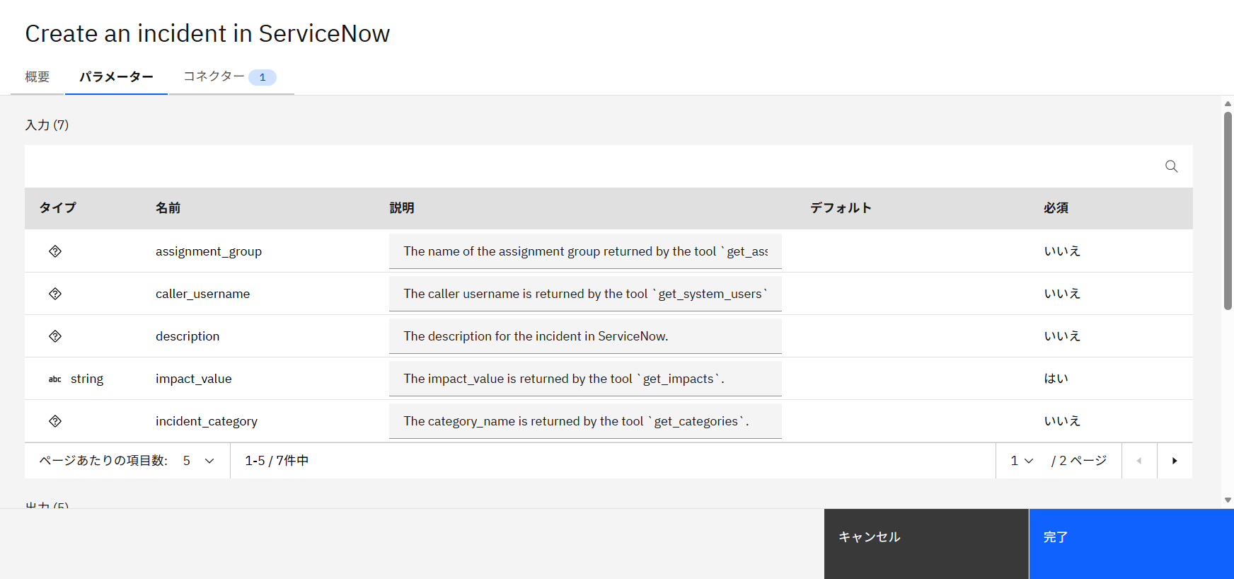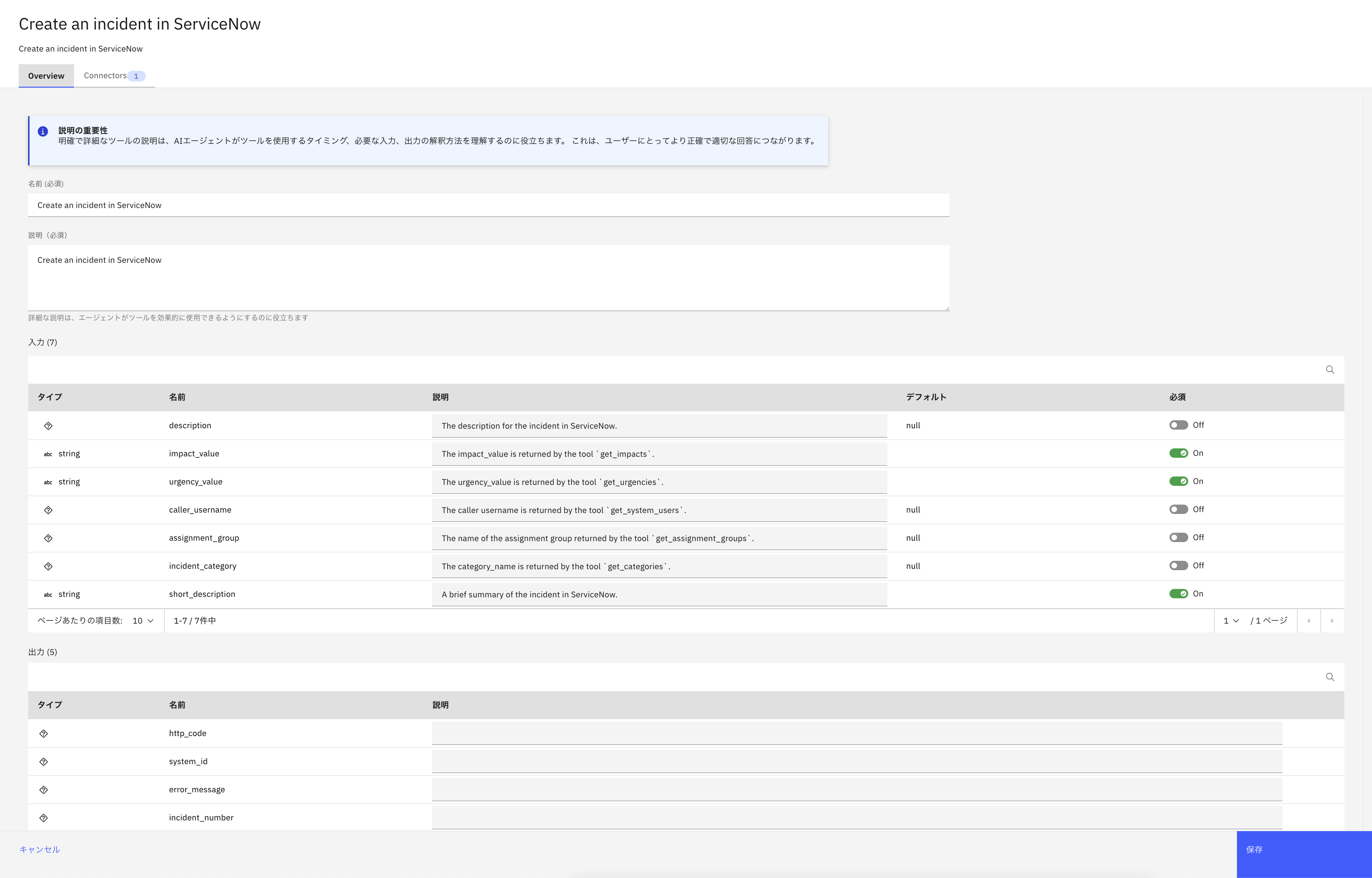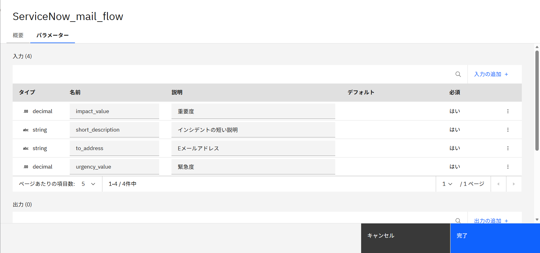 入力を7項目、出力を5項目定義していることがわかります。これらはすべて必須の項目ではなく、このツールの場合は"impact_value"、"urgency_value"、"short_description"の3つの入力項目を必須としています。