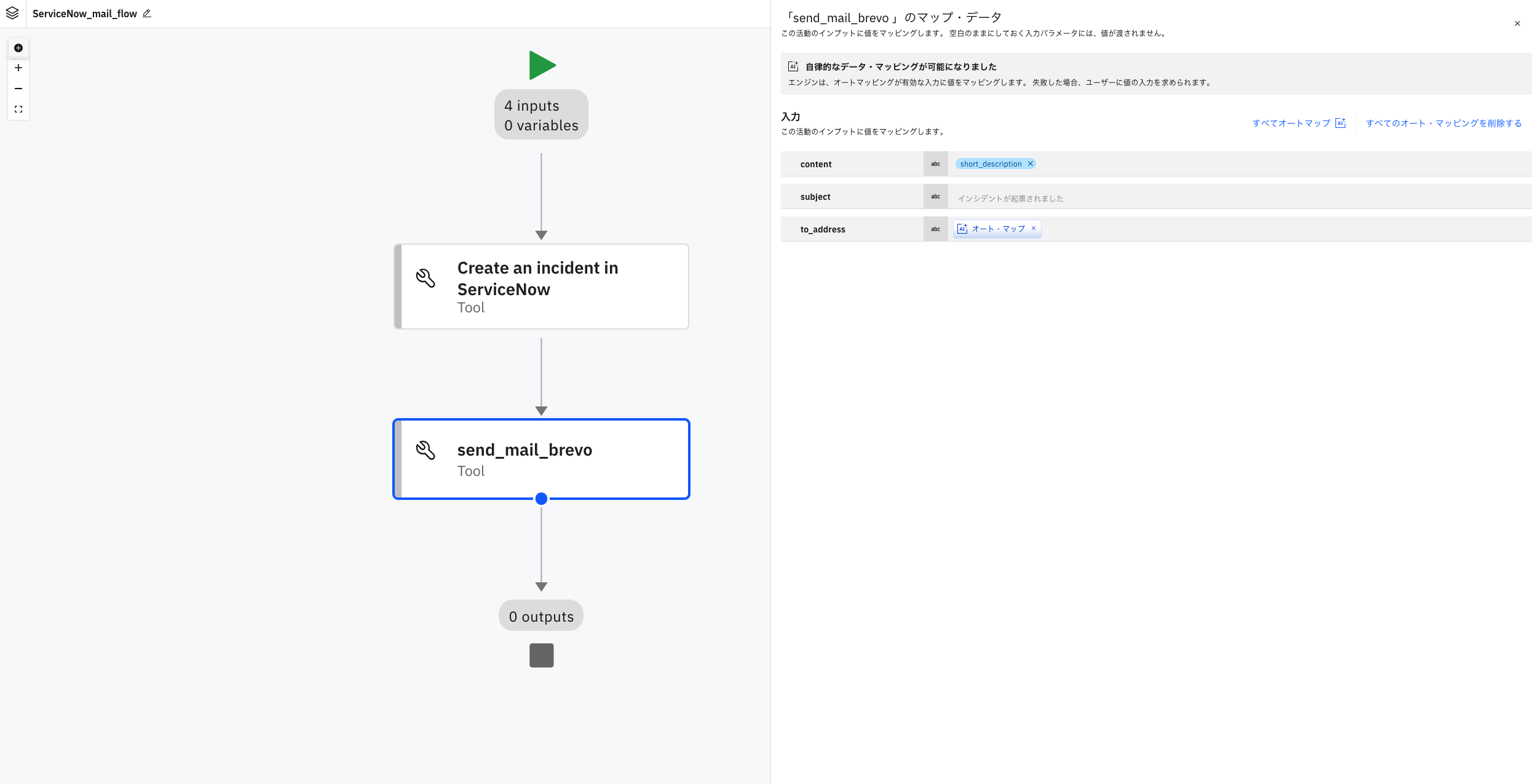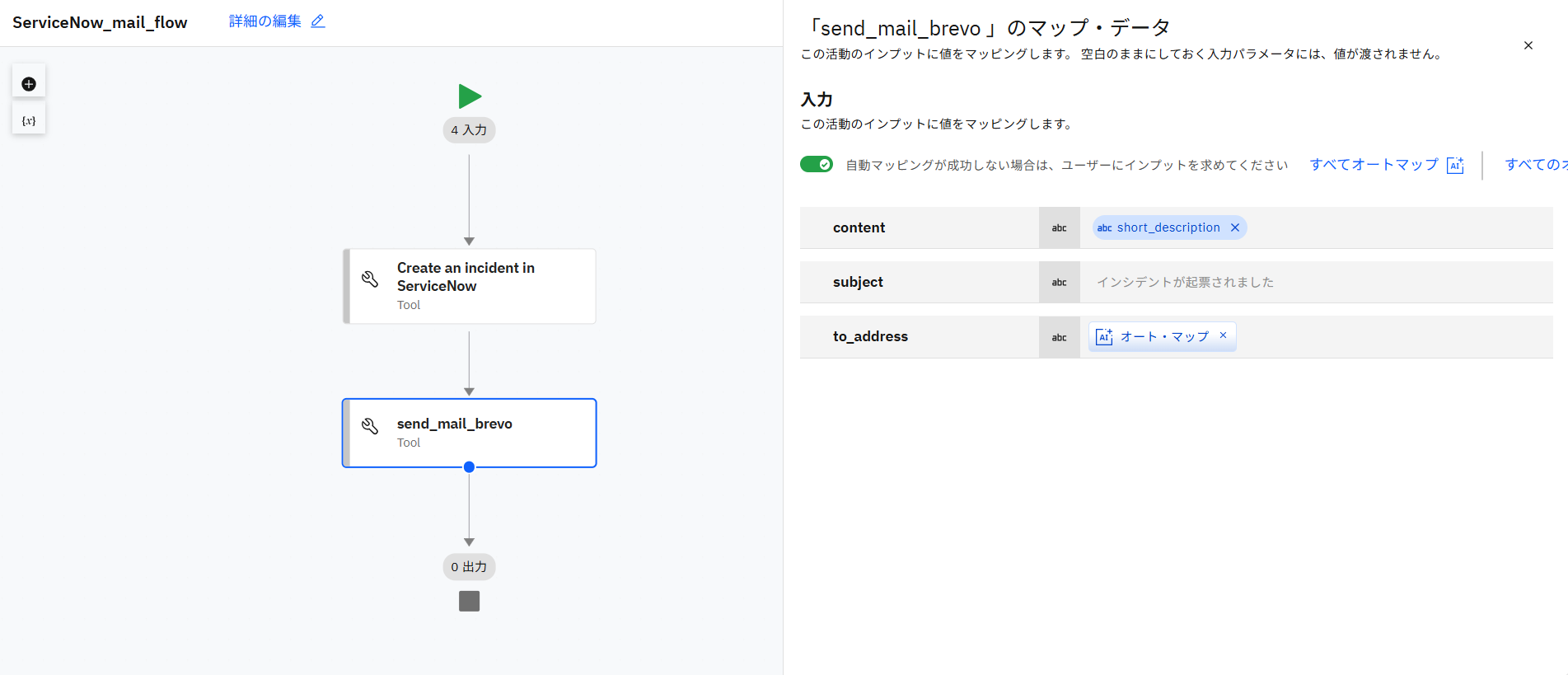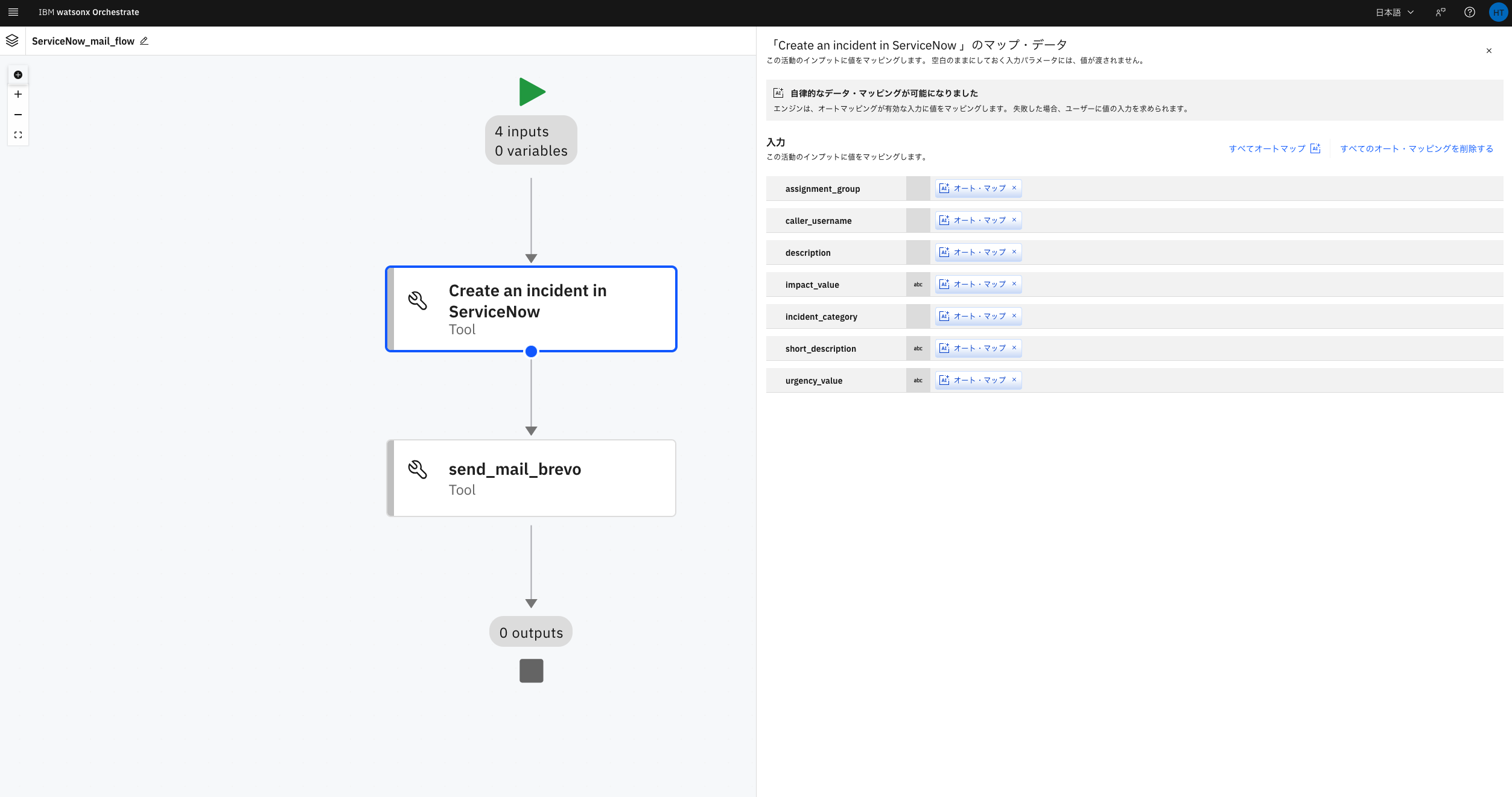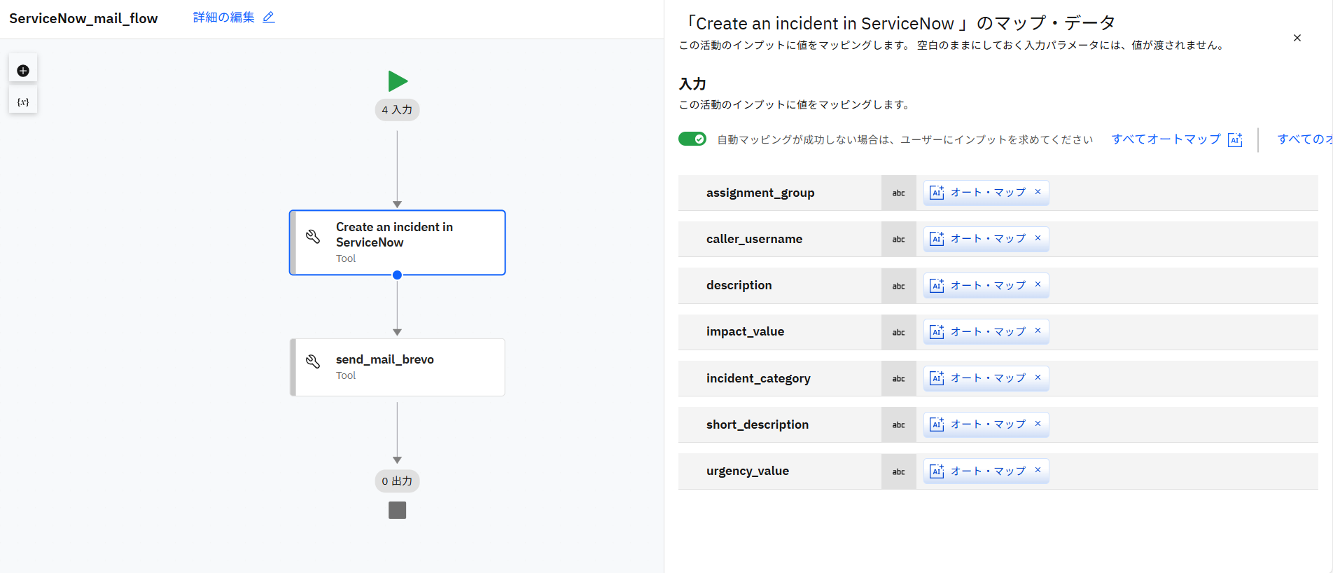 ServiceNowインシデント起票のツールのデータマッピングは修正せず、オート・マップのままにしています。