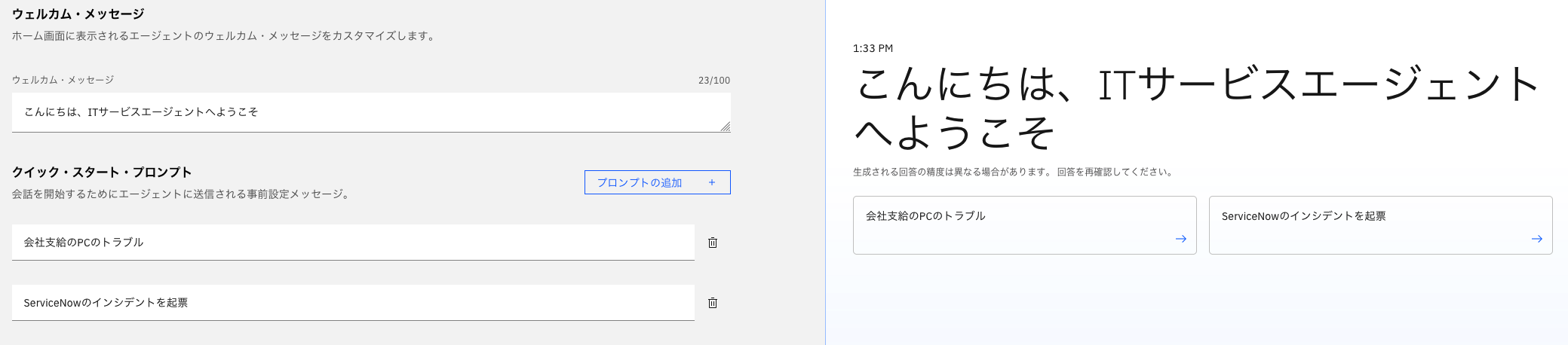 ウェルカム・メッセージやクイック・スタート・プロンプトも定義してみましょう。