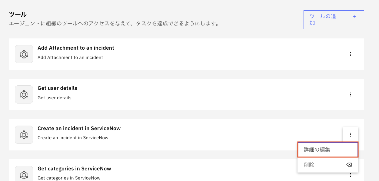 "Create an incident in ServiceNow"のツールで詳細の編集をクリックします。