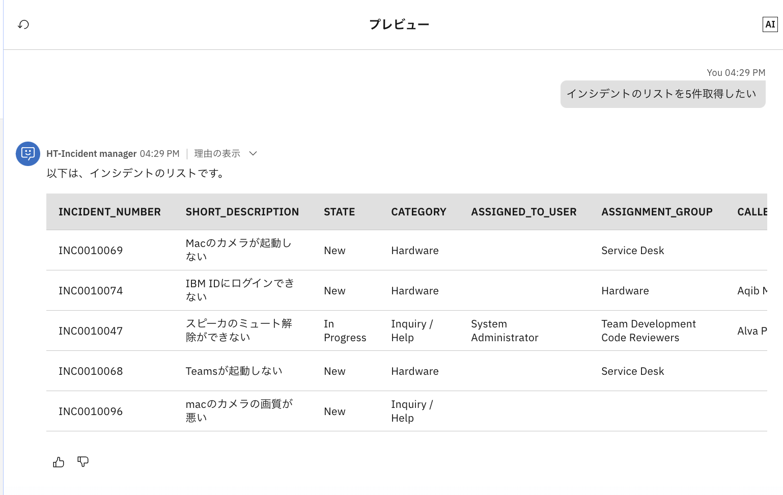 インシデントのリストを確認してみましょう。「インシデントのリストを5件取得したい」と入力してみてください。(Short Descriptionの日本語がおかしいインシデントがある場合があります。)