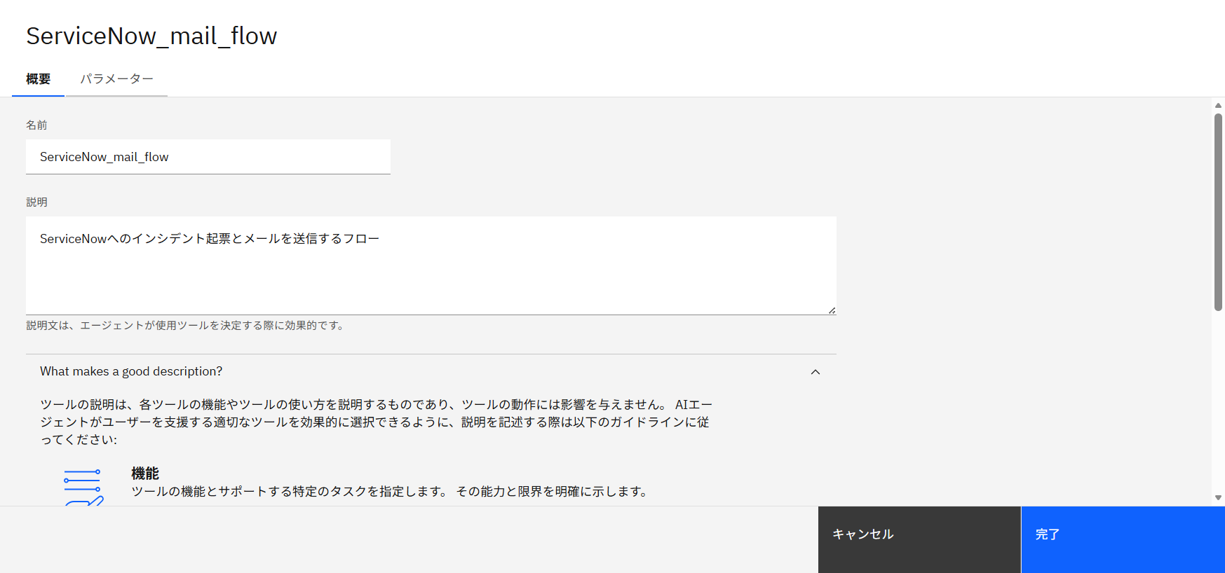 ツールの詳細を確認して、どのような入力と出力を定義しているか確認してみましょう。