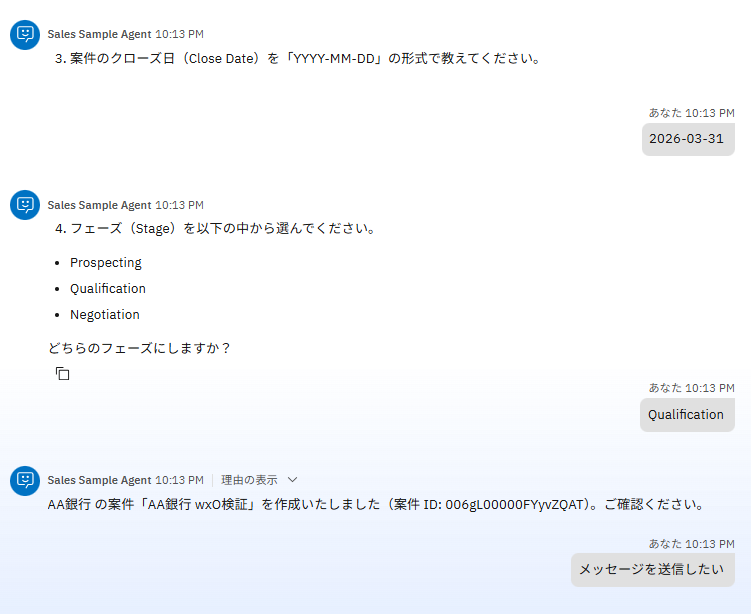 stage_name を質問する際は「フェーズ」と言い、Prospecting、Qualification、Negotiation のいずれかから選択してもらいます。