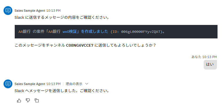 このハンズオンでは、営業支援のユースケースを想定して、Salesforce や Slack と連携したエージェントを作成しました。