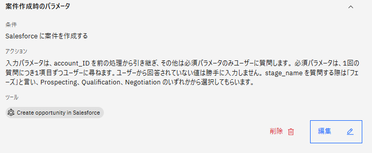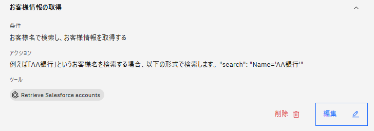 - ユーザーにお客様名を聞き、Retrieve Salesforce accounts を実行する