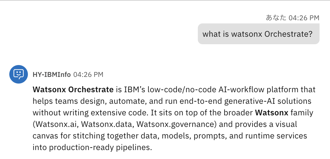 watsonx Orchestrateに関する回答が返ってくることが確認できました。こちらは選択されたLLMが回答を作成しています。