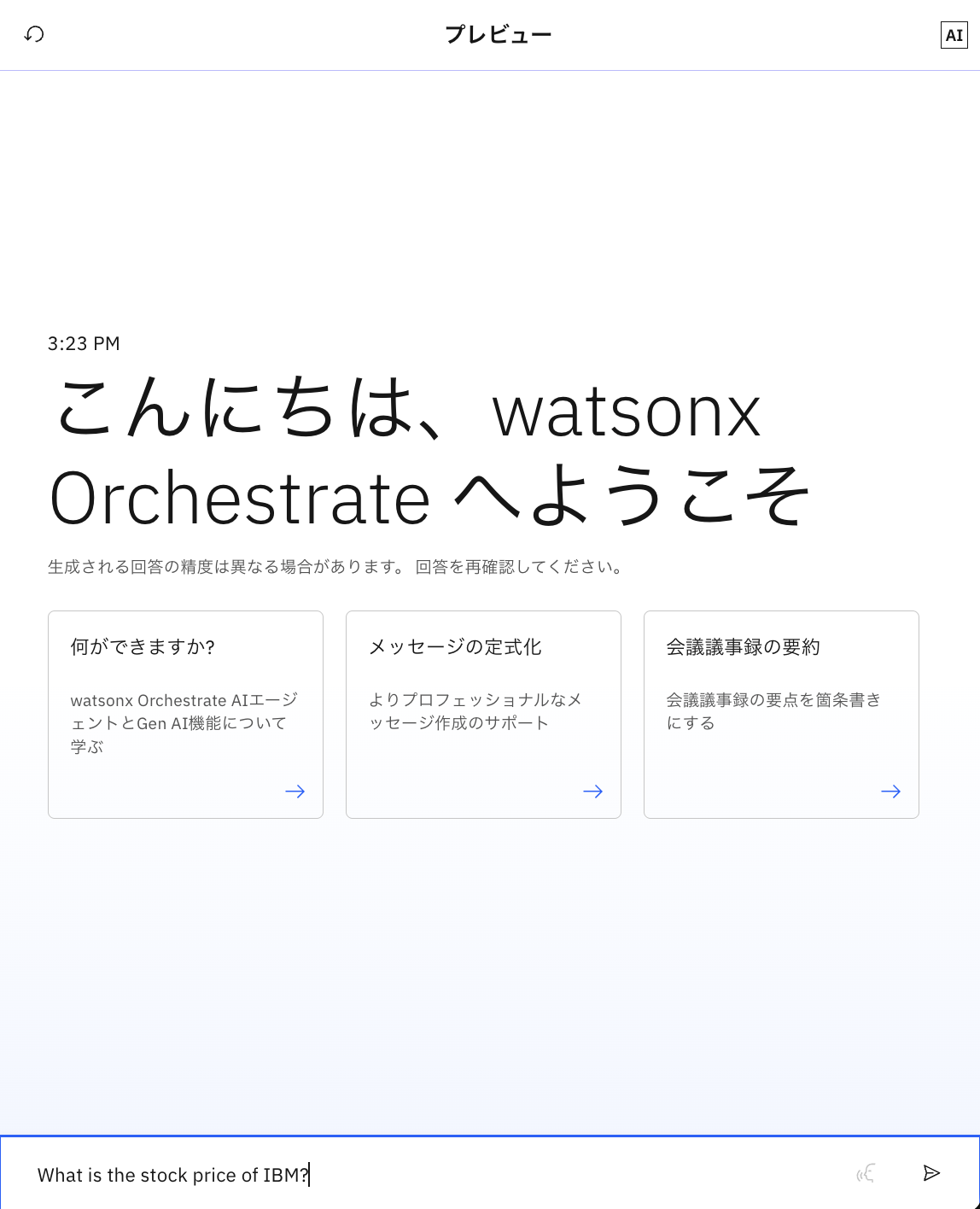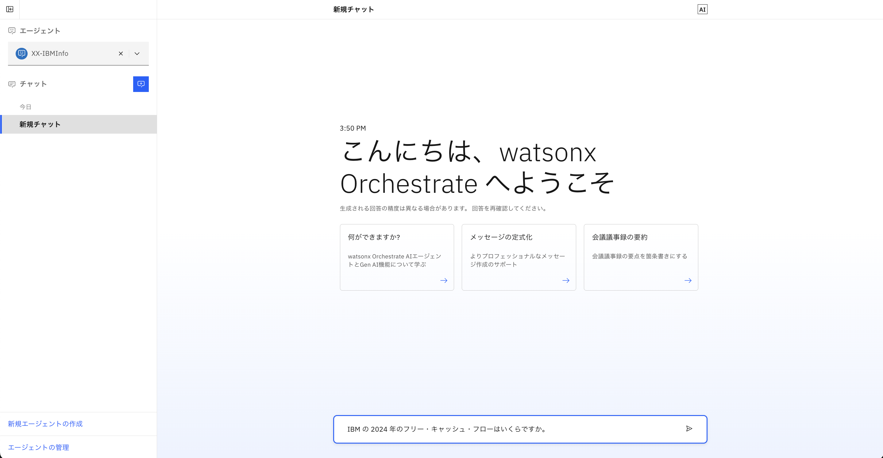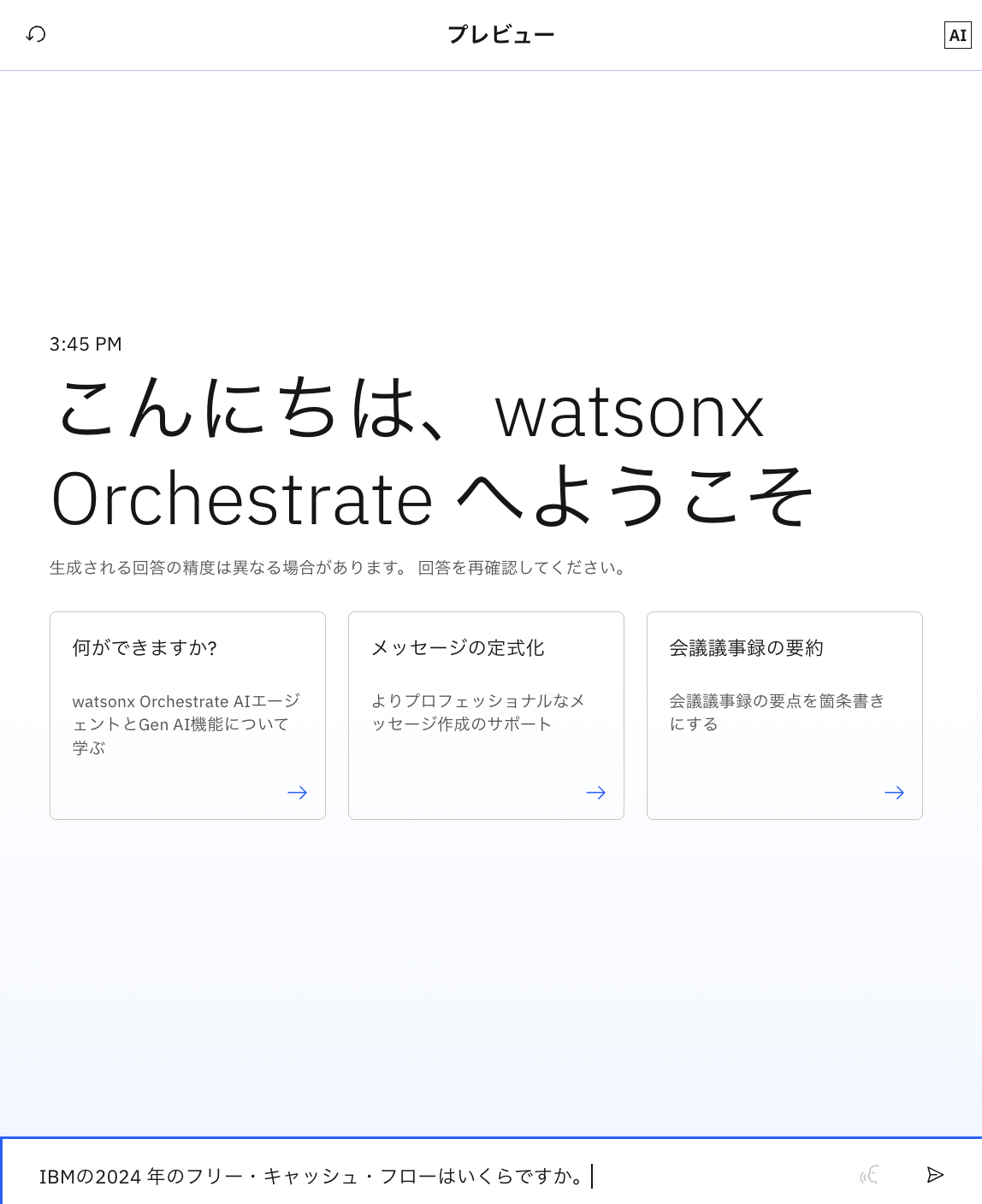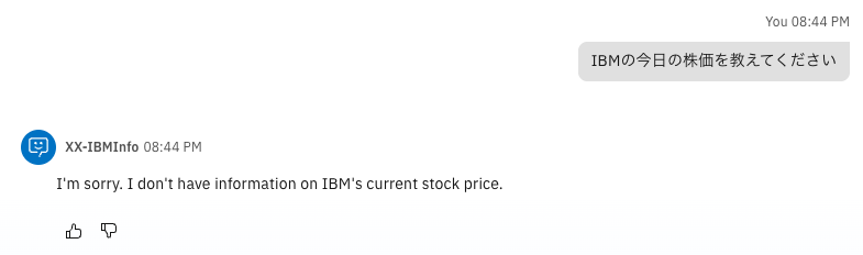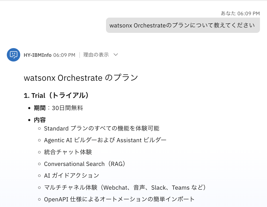 watsonx Orchestrateが先ほど読み込んだファイルの内容をもとに、適切な回答を行っていることが確認できます。